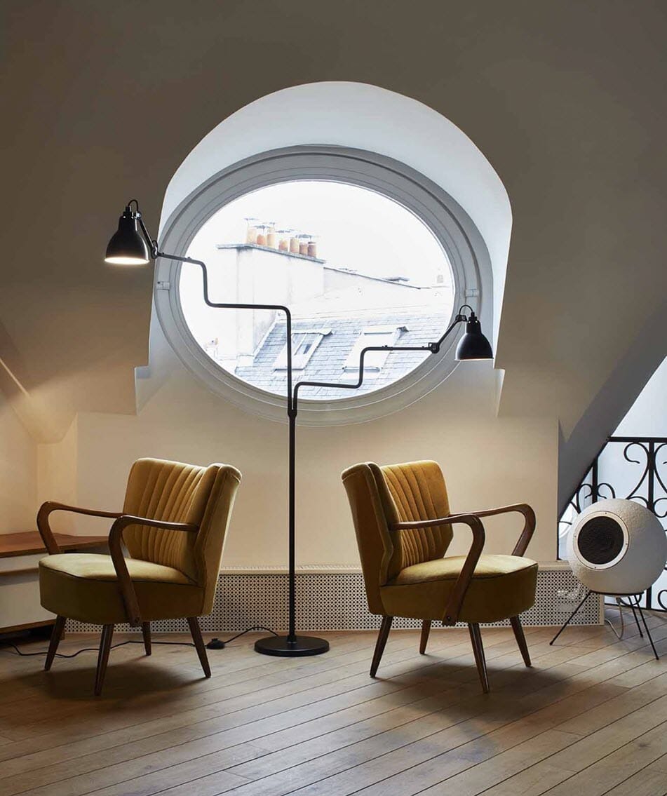Dette er en dobbel gulvlampe som egner seg godt for lesing, laget med fantastiske proporsjoner, svært justerbare og grafiske takket være dobbel-albue (det gjør at den kan dreies to ganger gjennom 340 °) og en ideell høyde (120 cm) for bruk ved siden av en sofa, bak en seng eller over en arbeidsflate. Og du trenger kun ett punkt for to lamper!