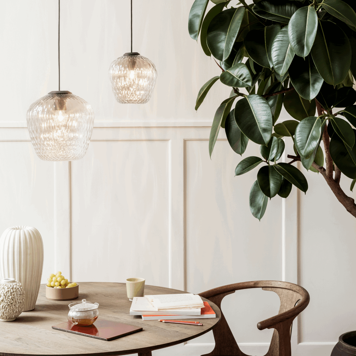 Med sin avrundede form og sofistikerte Silver Lustre-finish, har Blown et tidløst og moderne uttrykk som lett integreres i ulike interiørstiler. Lampen er et eksempel på raffinert håndverk, der glasset blåses for hånd i form, før det kombineres med en pulverlakkert sinkoppheng og sort tekstilledning for en helhetlig og elegant finish.