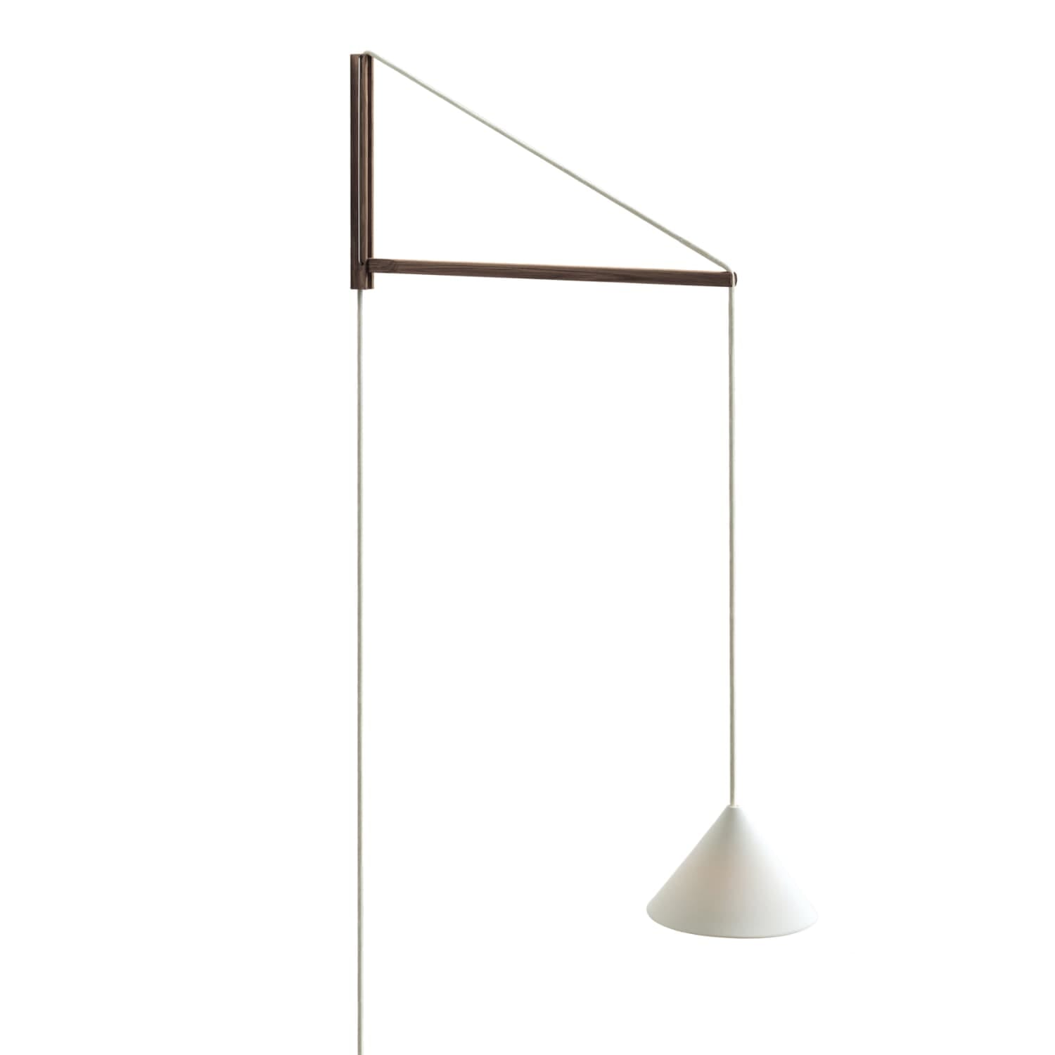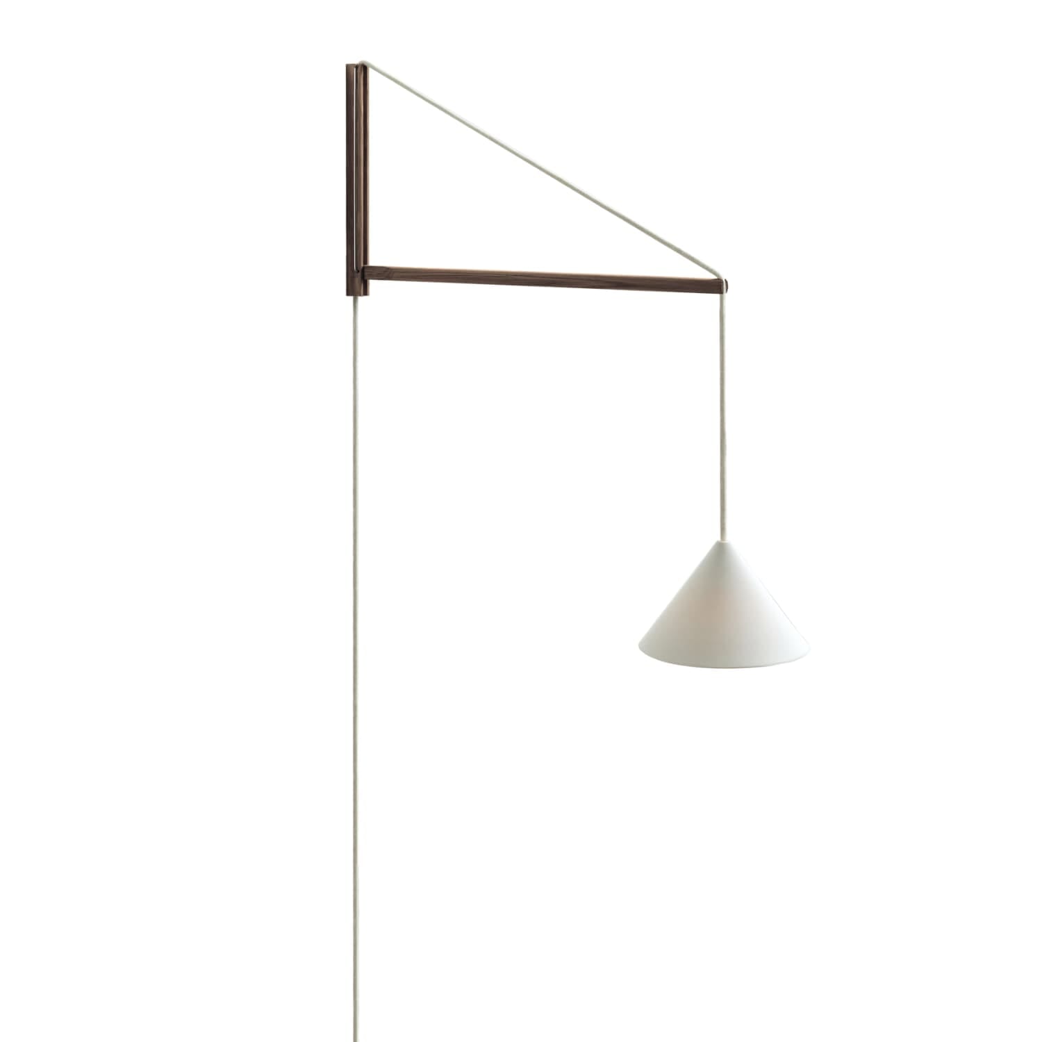 Lampen er bygget opp av fire deler: en solid veggbrakett i FSC-sertifisert røkt eik, en støttende wire i rustfritt stål, en bevegelig arm og en kabel med keramisk skjerm. Den gjennomtenkte konstruksjonen gjør det enkelt å justere både høyden på skjermen og avstanden fra veggen, slik at du kan skape riktig lyssetting for alt fra lesekrok til stemningsfull belysning i stue eller soverom.