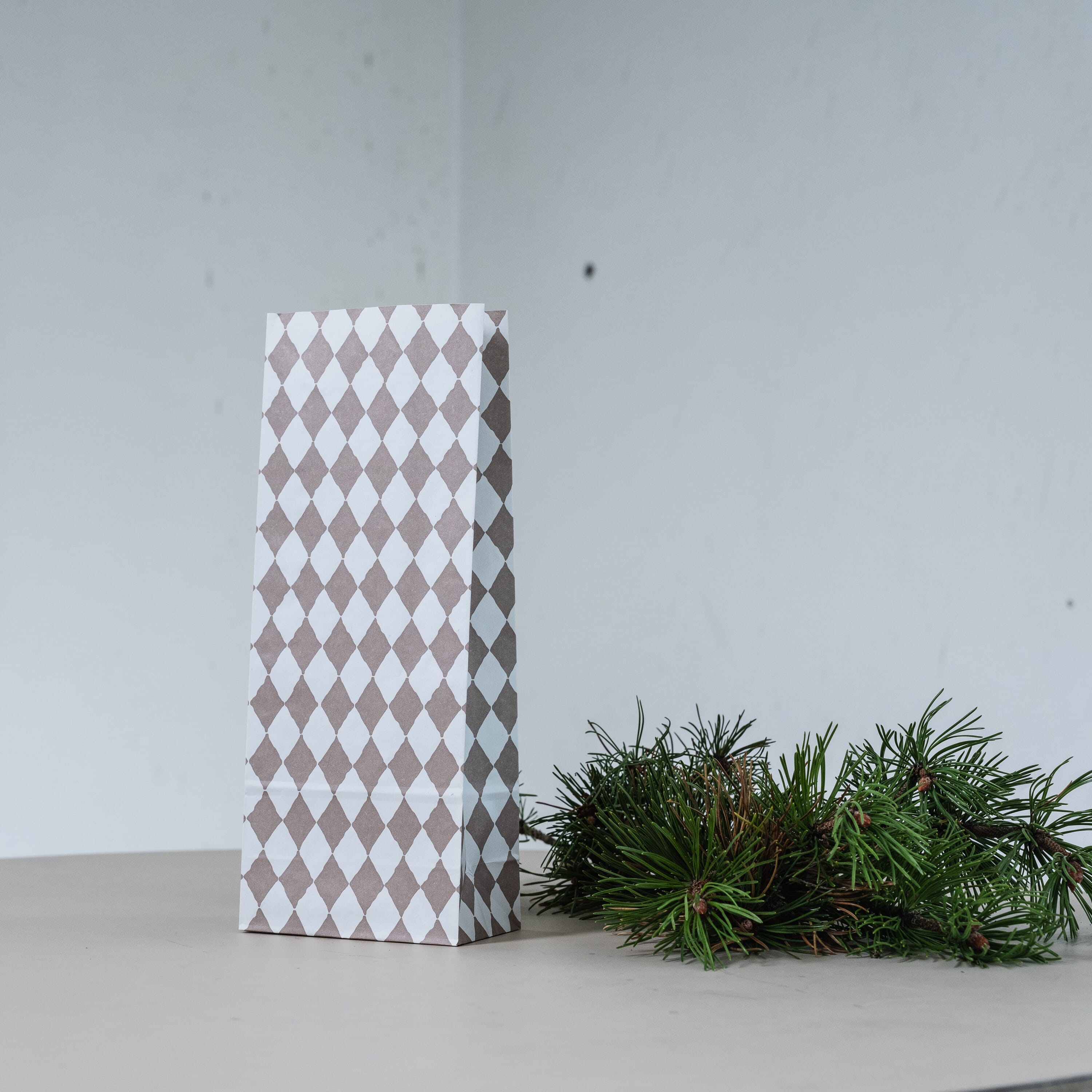 Denne elegante kalenderposen med rutemønster er et utmerket valg for deg som ønsker en enkel og stilren adventskalender. Laget av slitesterkt papir, er posen dekorert med et tidløst harlekinmønster i beige og hvitt, som gir en klassisk følelse med en moderne vri. Den er romslig nok til å inneholde små overraskelser, gaver, eller søtsaker, og passer perfekt til å lage en personlig og kreativ adventskalender til både voksne og barn.