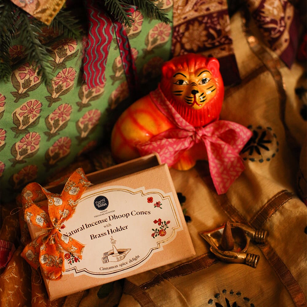 Fyll hjemmet ditt med den innbydende duften av kanel med vårt Kanel Røkelseskjegle Gavesett. Dette vakre settet inkluderer en nøye utformet røkelseskjegleholder laget av resirkulert messing, formet som to hender som varsomt holder en skål, og 20 blomsterresirkulerte røkelseskjegler med kanelduft. Håndlaget med omhu av våre dyktige håndverkere i India, er dette gavesettet perfekt for å skape en koselig og velduftende atmosfære i hjemmet. Dette settet er den perfekte gaven til venner og familie som setter pris på håndlagde og aromatiske gleder.