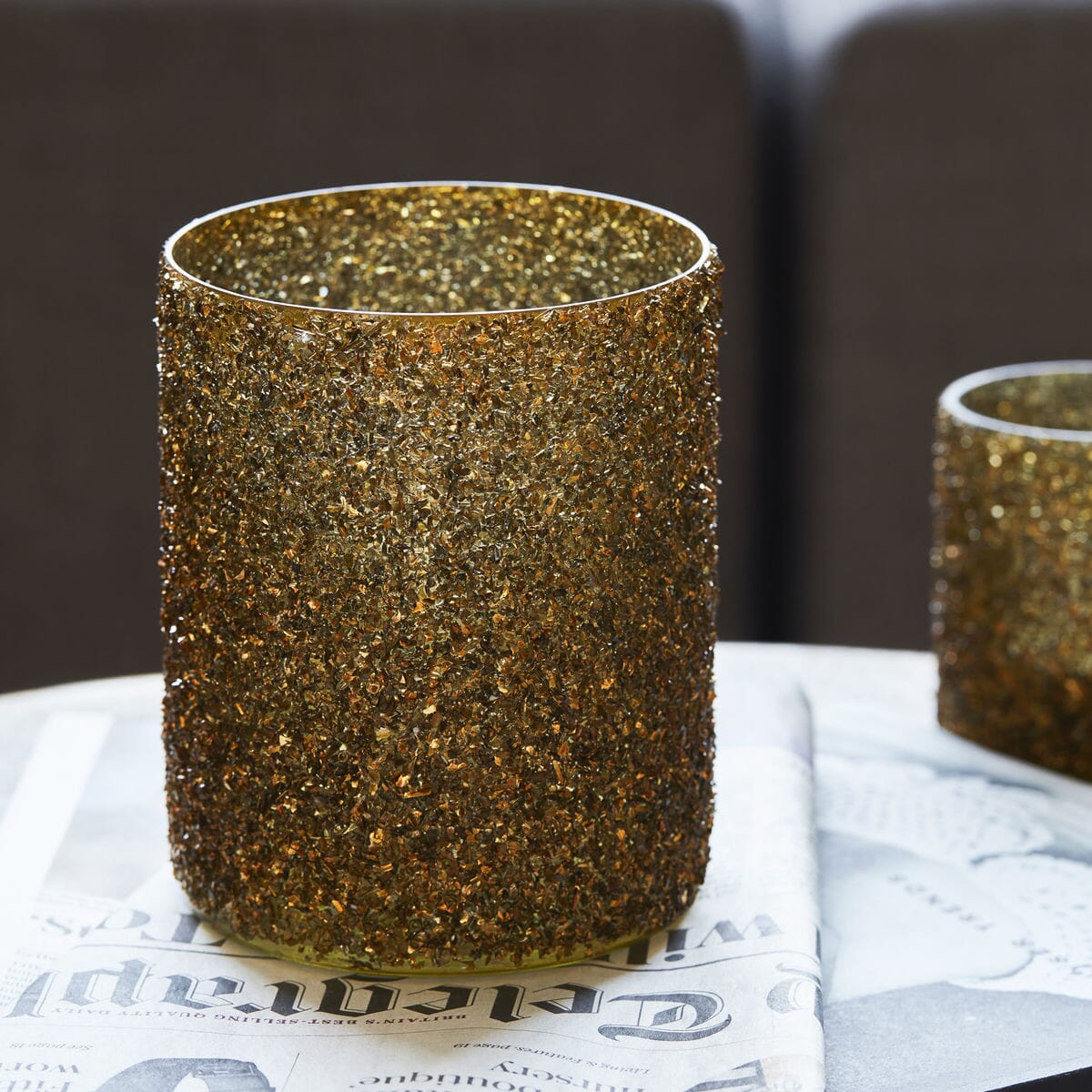 Tilføy glitter i hjemmet med den store Gliz telysestaken fra House Doctor. Den gyldne fargen er spraymalt på lysestaken - et perfekt utseende for å skape en innbydende atmosfære når lyset skinner gjennom. Plasser telysestaken i vinduskarmen sammen med favorittvasene og skåler i lignende farger. Eller kombiner den med den mindre versjonen og plasser dem begge på salongbordet. Den strukturerte overflaten er et lekent og balansert tilskudd til hjemmets innredning laget av tre, keramikk og metaller.