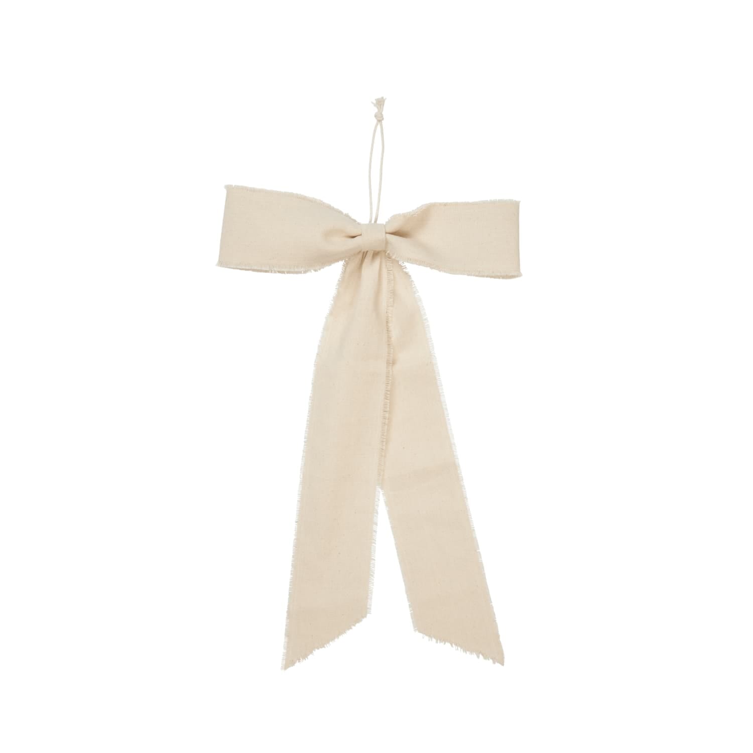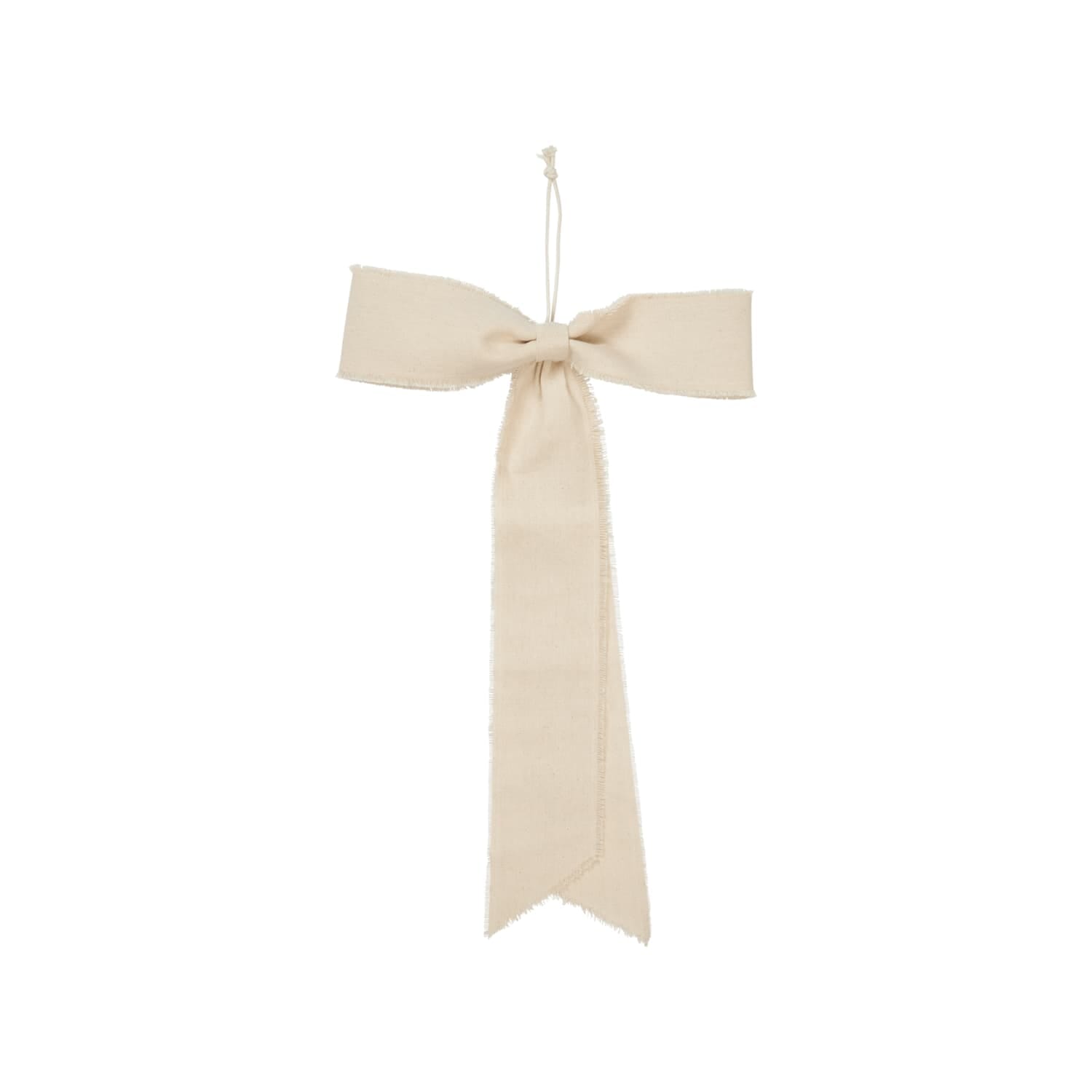 Denne håndlagde sløyfen er laget av 100 % GOTS-sertifisert økologisk bomull – et bærekraftig valg som kombinerer tidløs enkelhet med en avslappet, festlig sjarm. De frynsete kantene og de lange, flytende båndene gir sløyfen et uformelt og lekent preg, samtidig som den har en innebygd hempe som gjør den enkel å henge opp.