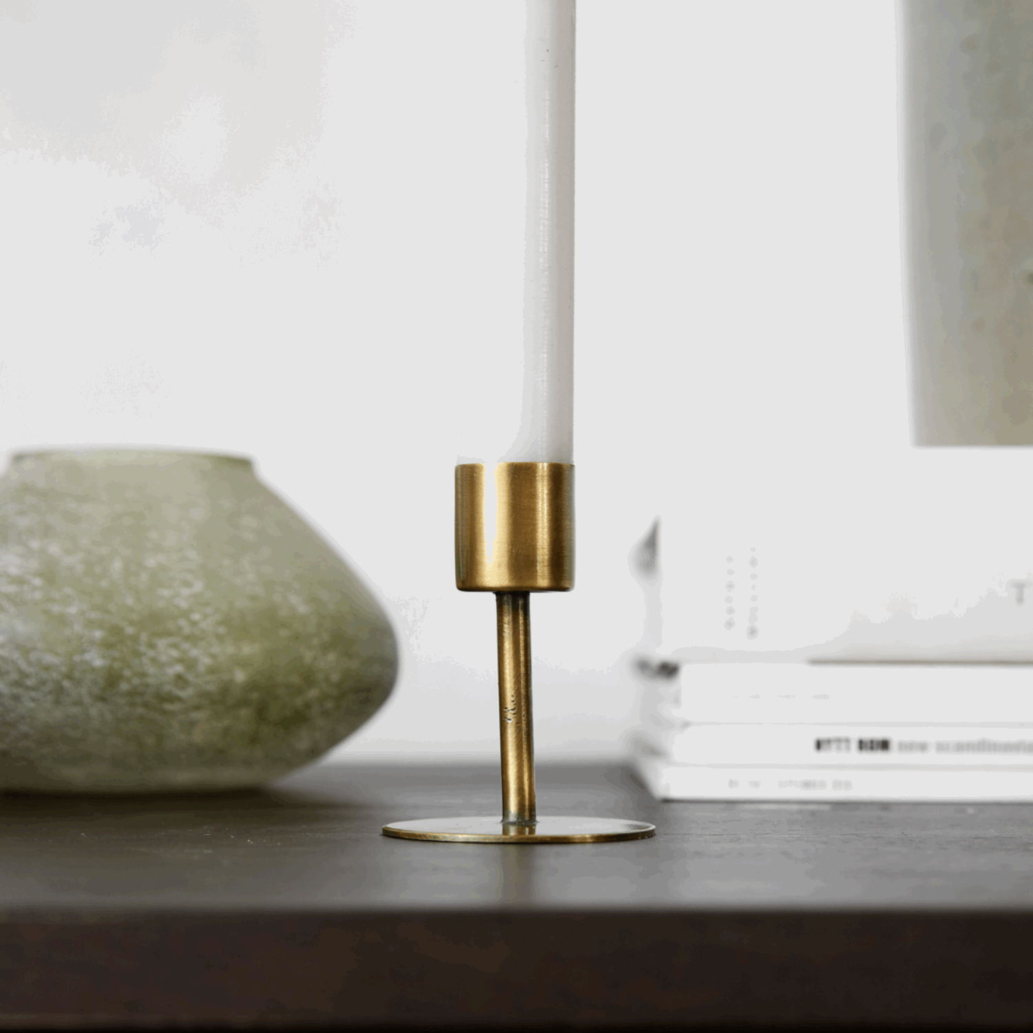 Denne vakre lysestaken i jern med antikk messingfinish kombinerer en rå, tidløs estetikk med et enkelt og harmonisk design preget av myke, runde former. Anit passer perfekt til små stearinlys med en diameter på 2 cm, og kan brukes alene som en elegant borddekorasjon, eller settes sammen med lysestaker i ulike høyder og materialer for et spennende og personlig uttrykk. Den antikke messingfargen gir en varm glød og tilfører karakter til både moderne og tradisjonelle interiører.