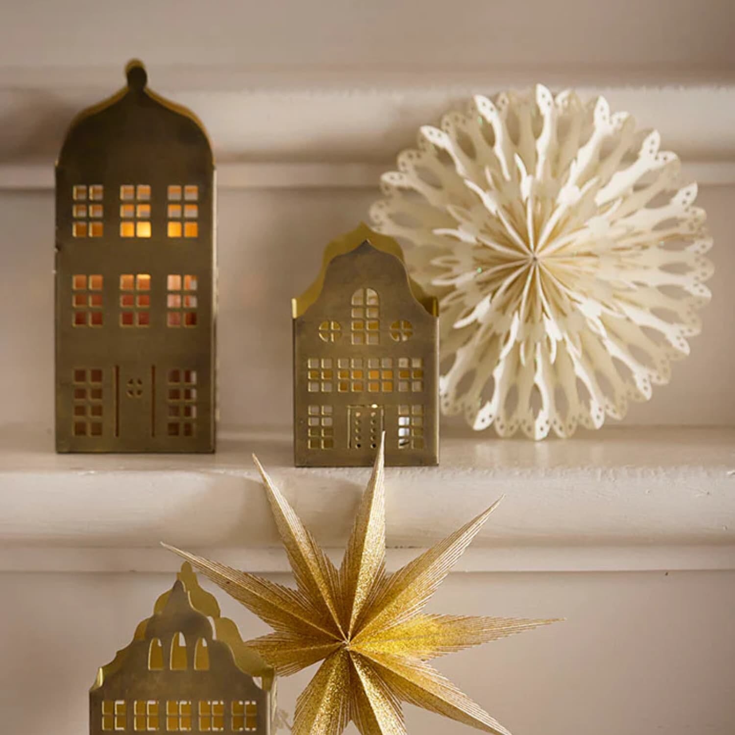 Lysestake Brownstone H13 cm Golden er en sjarmerende lysestake utformet som et lite byhus, med en varm messingfinish som gir interiøret et gyllent og stemningsfullt preg.