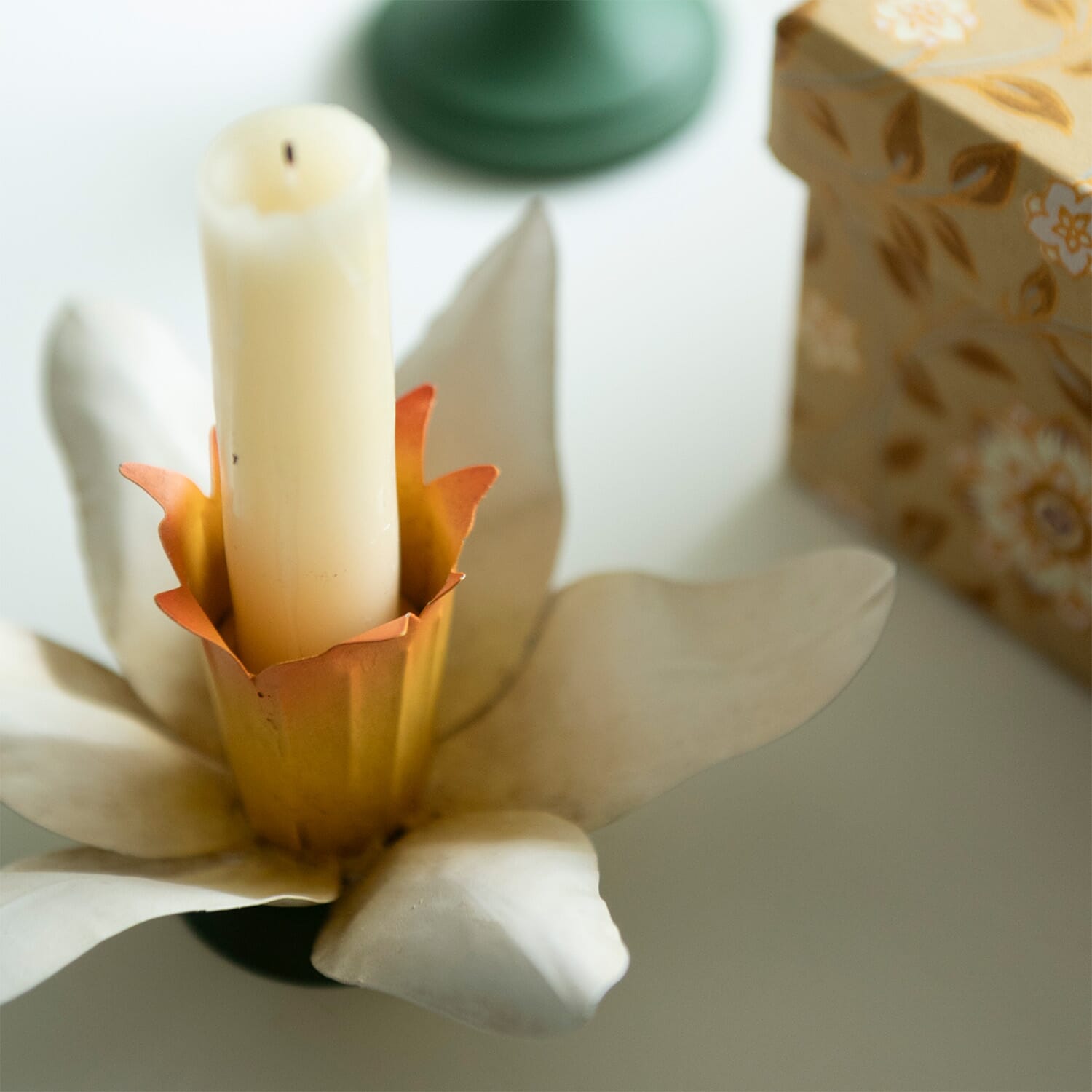 La lyset skinne gjennom tidløst håndverk med denne vakre lysestaken, inspirert av naturens organiske former. Med sitt unike design formet som en blomstrende knopp, tilfører den et poetisk uttrykk til ethvert bord eller interiør.