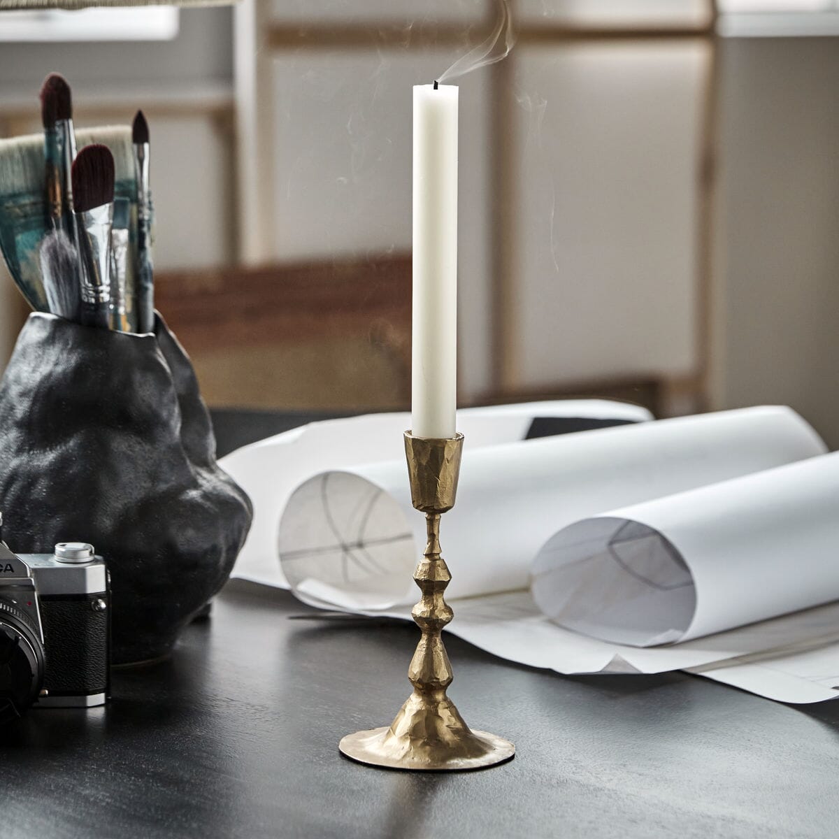 Flott håndlaget lysestake i jern, farget i en nydelig antikk gull farge. Den er perfekt for å tilføre en subtil touch av sofistikasjon til ethvert rom eller anledning. Lysestaken har en stabil og dekorativ base og har en tidløs eleganse som passer inn overalt.