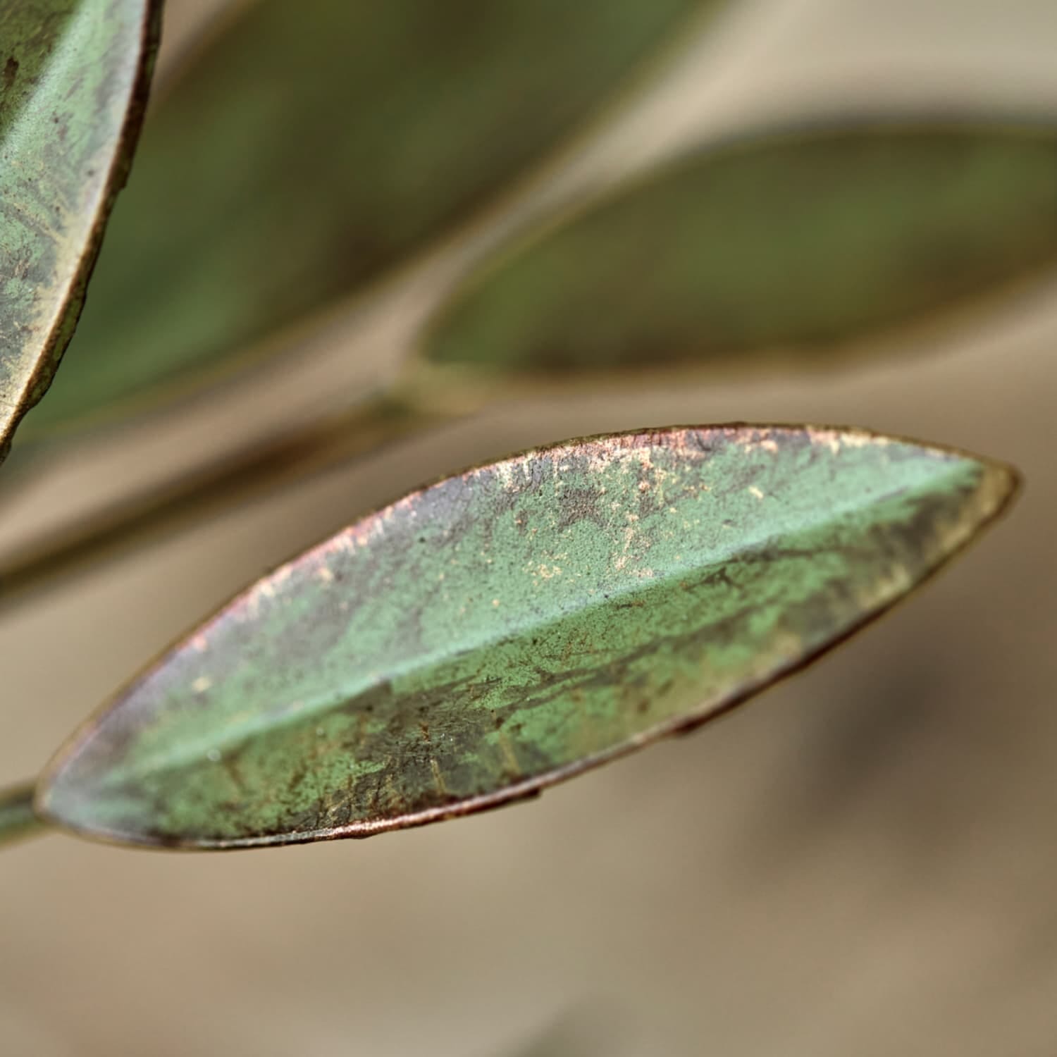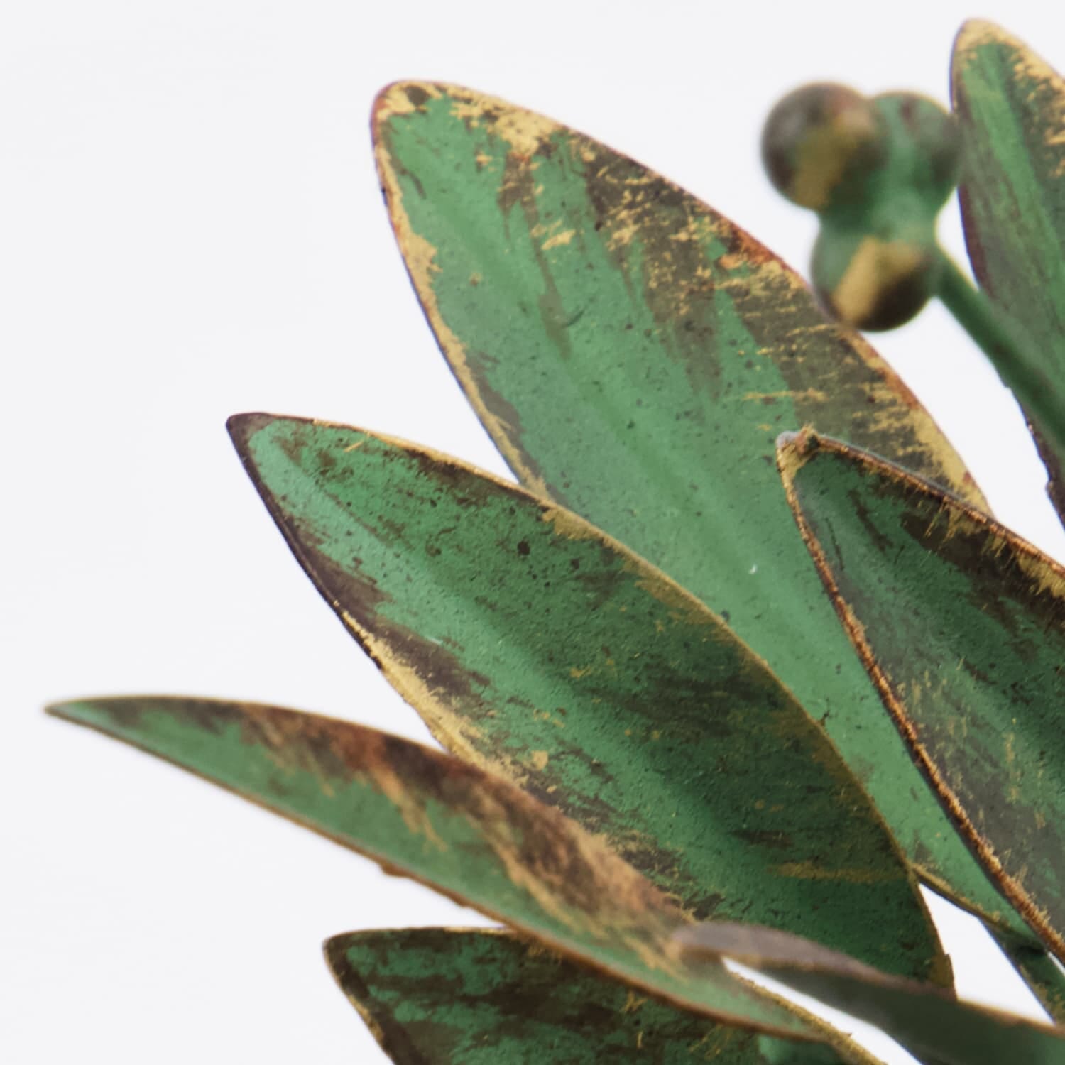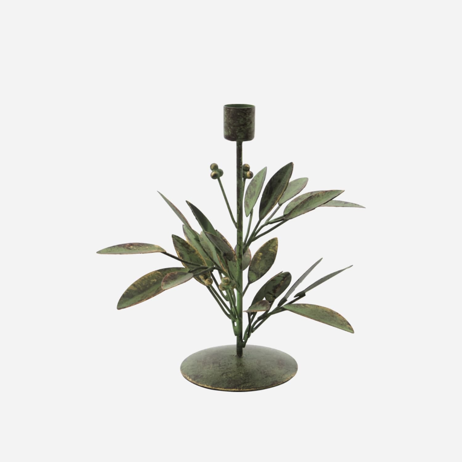 Denne håndlagde lysestaken i jern er utsmykket med vakre blader og bær, og kombinerer botanisk eleganse med vintage sjarm.
