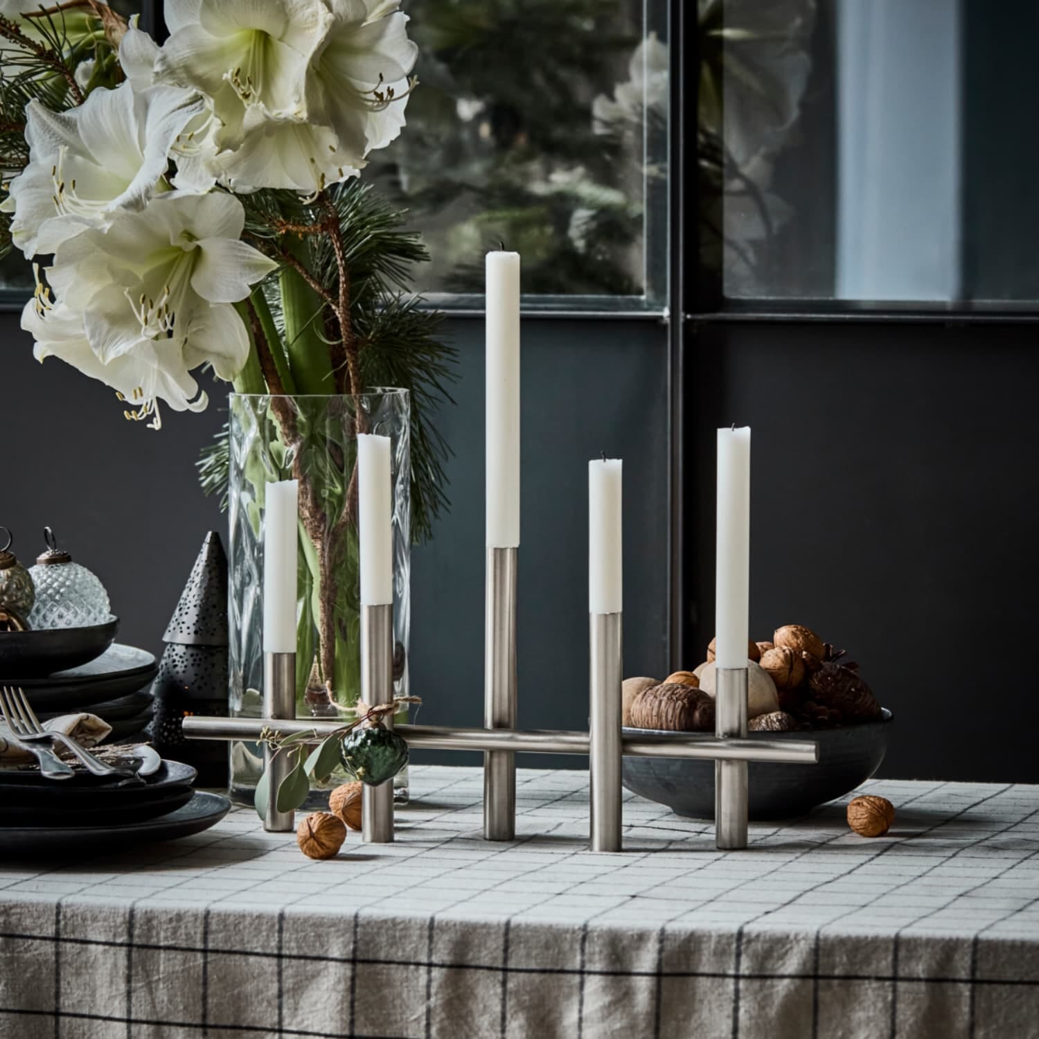 Laget i solid jern og håndlaget for et unikt uttrykk, får hver lysestake små variasjoner i farge, finish og størrelse, noe som gir en særegen karakter. Med sitt stilrene design kan den enkelt pyntes med granbar, blomster eller dekorative elementer for å skape et personlig uttrykk som passer sesongen.