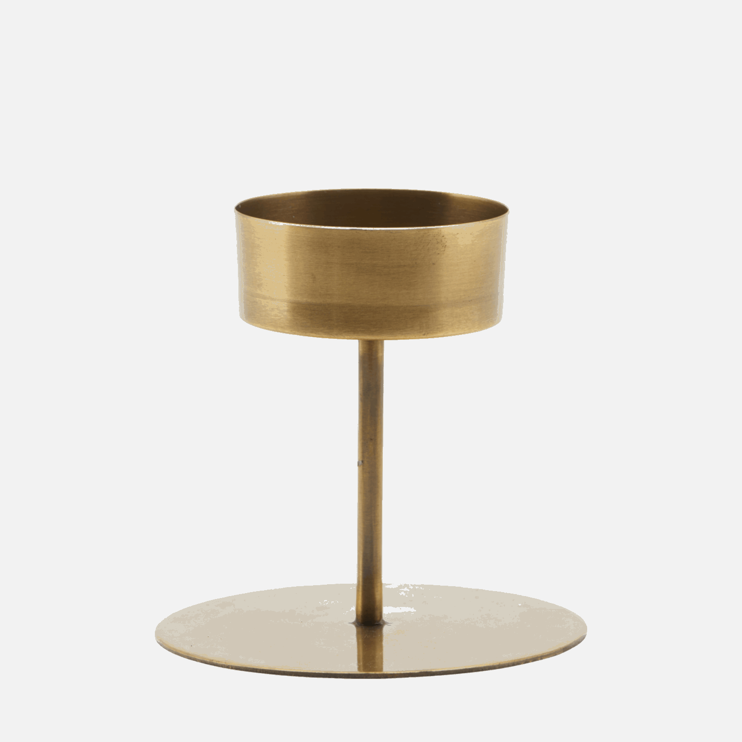 Denne stilrene lysestaken i antikk messingfinish og solid jern kombinerer rå materialitet med myke former. Resultatet er en dekorativ og tidløs lysholder som passer perfekt til både telys og små stearinlys.