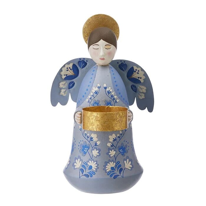 Helt unik telysholder fra danske Bungalow. Denne vakre engelen, med den nydelige blå fargen symboliserer beskyttelse og omsorg. Den finnes også i fargen Ruby. Er håndmalt med Marigold-mønster. Vingene må monteres og er laget av håndmalt lakkert metall. La lyset fra telyset skinne gjennom det delikate mønsteret og skape en fredelig stemning i julen.