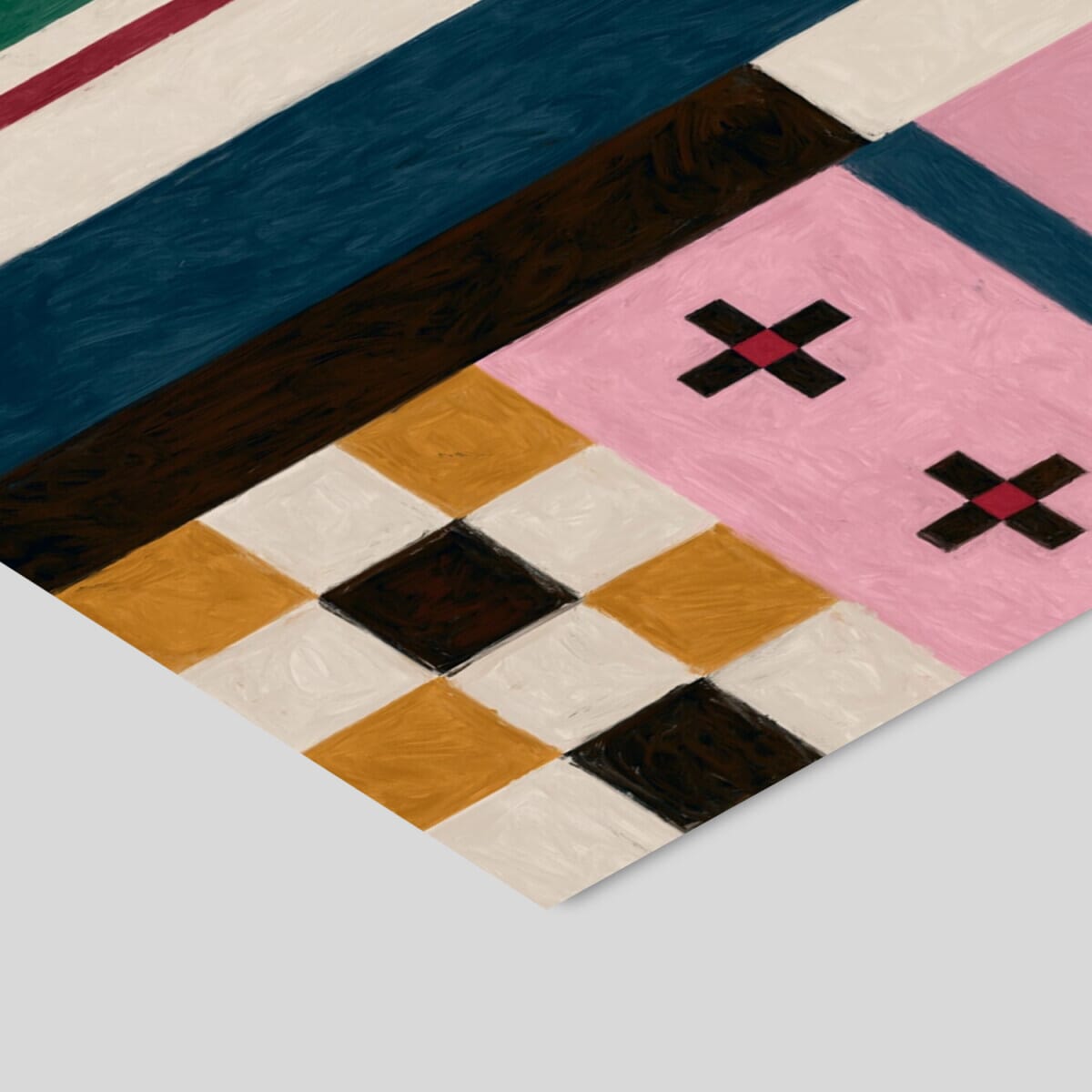 Med sin umiskjennelige sans for balanse og rytme skaper NKTN et verk som både utfordrer og beroliger. Dette abstrakte motivet består av en geometrisk komposisjon i jordnære, men levende farger – fra sennepsgul og dus rosa til dyp blå og sort. Kombinasjonen av striper, sjakkruter og korsformer skaper en visuell rytme som føles både moderne og tidløs.