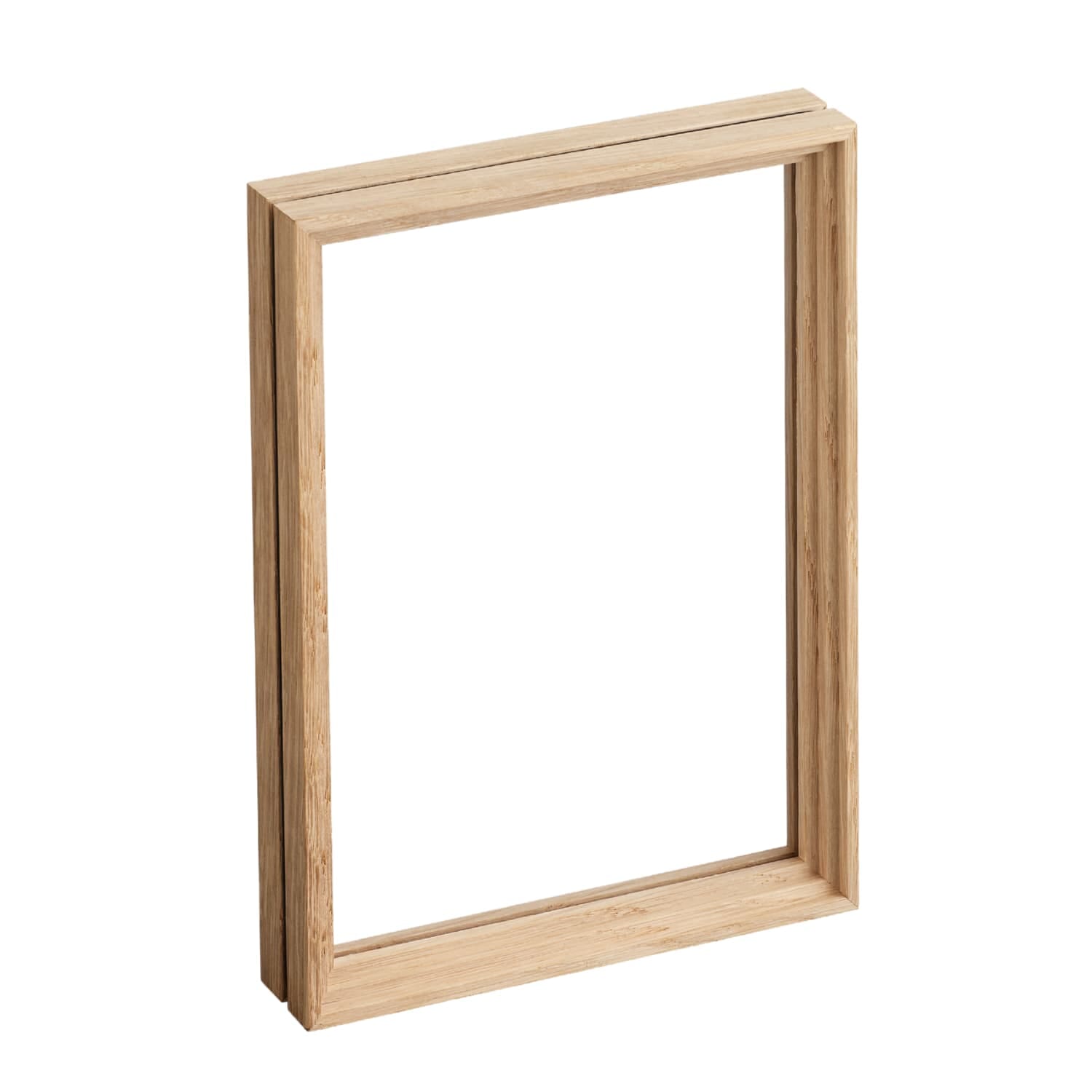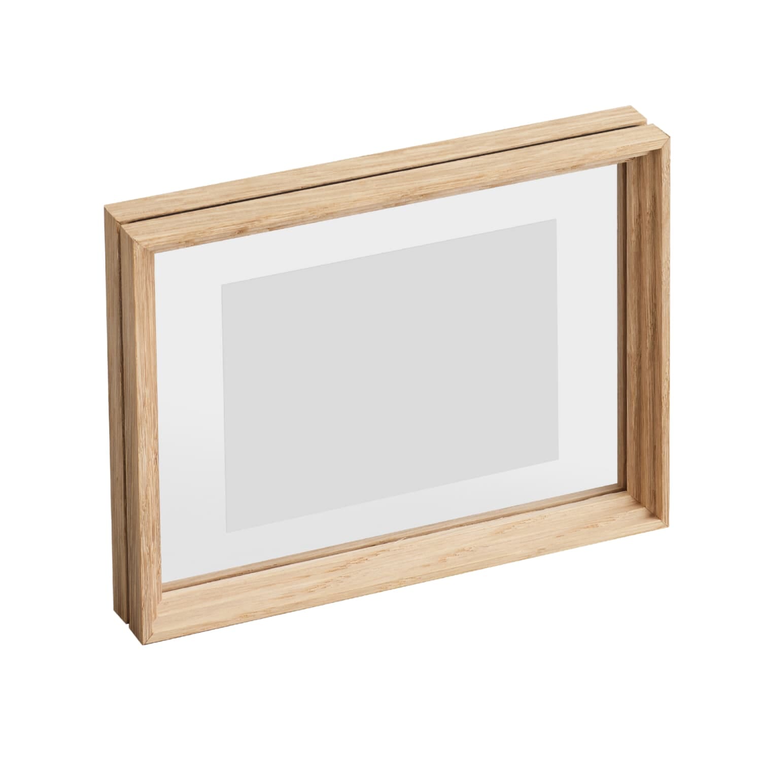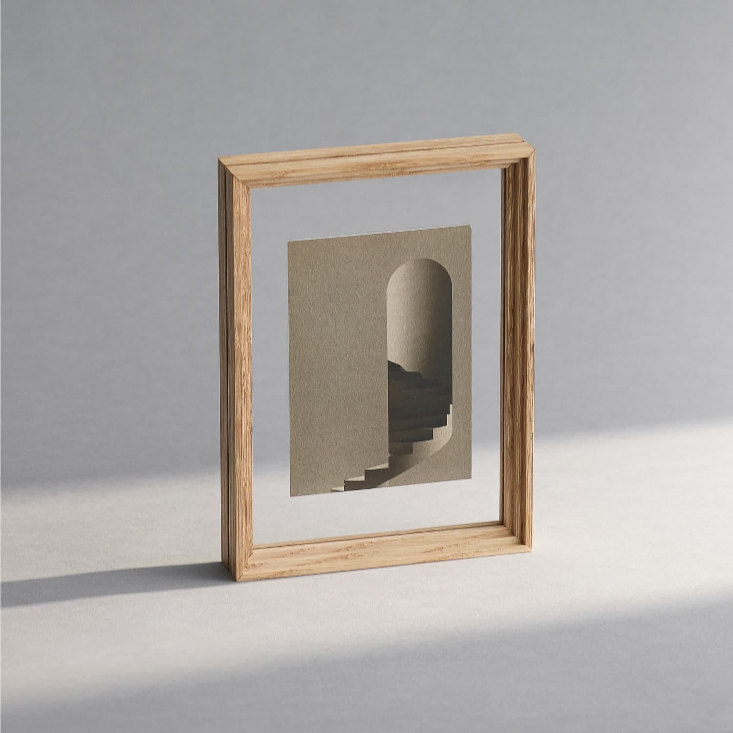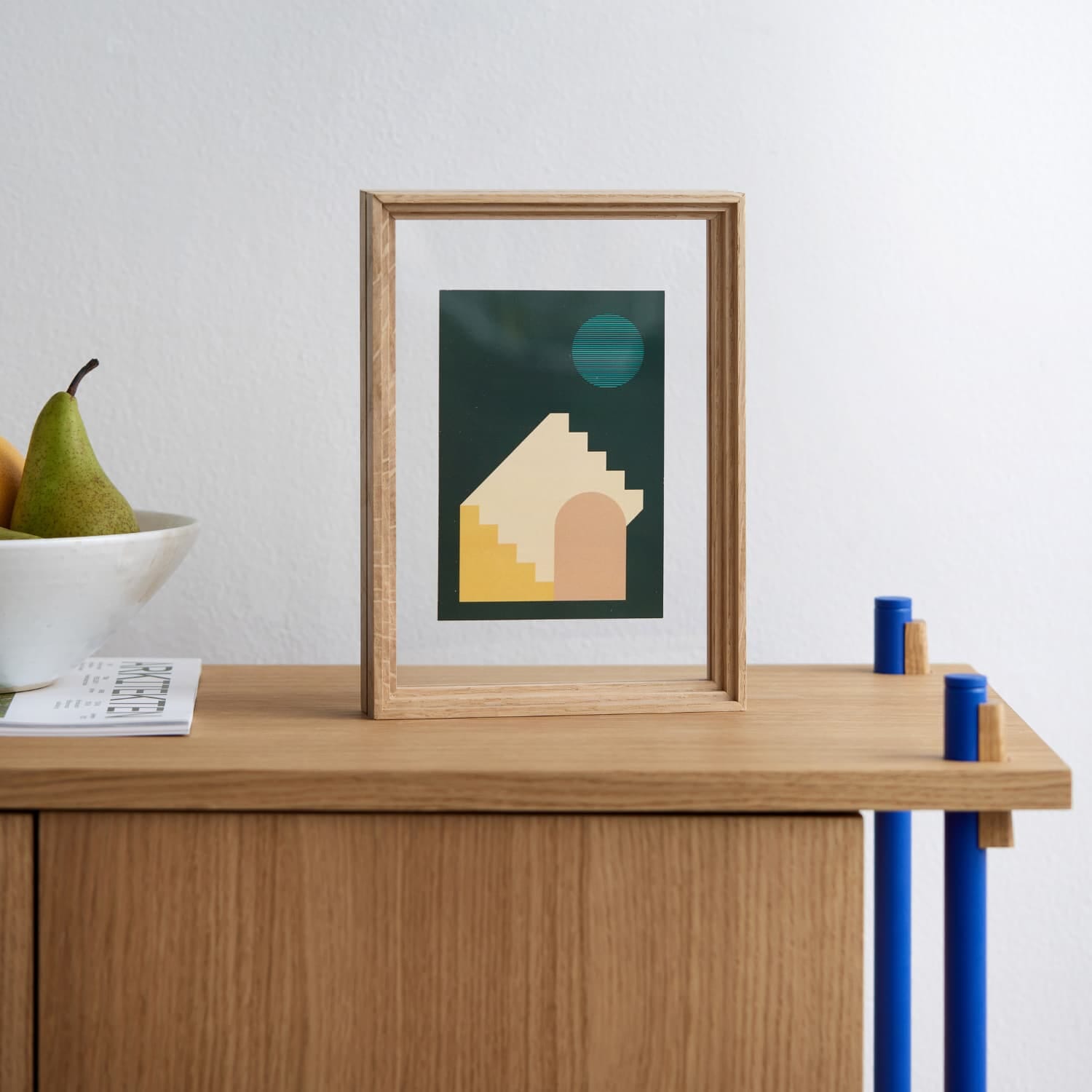 Rammen er bygget opp av fire sider i naturlig, FSC-sertifisert eik, to plater i akrylglass og et solid gummibånd som holder alt sikkert på plass. Den står stødig av seg selv, og kan plasseres på en hylle, et skrivebord eller en kommode der du ønsker å skape en personlig og varm atmosfære. Takket være den enkle løsningen kan innholdet byttes ut når du vil, slik at rammen kan følge sesong og stemning – fra minnerike fotografier til naturens små detaljer.