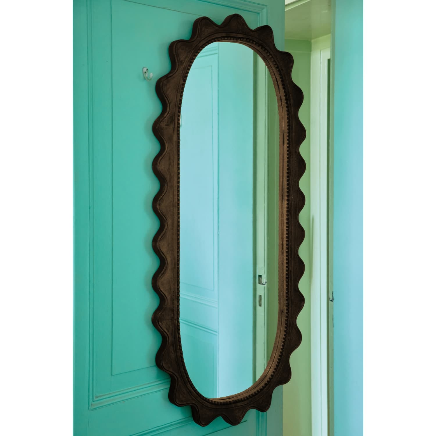 Den mørkbeisede rammen i mangotre er dekorert med lekne, bølgende riller som tilfører tekstur og dybde, og gir speilet en unik karakter. Resultatet er et funksjonelt interiørelement som også fungerer som en dekorativ skulptur på veggen.