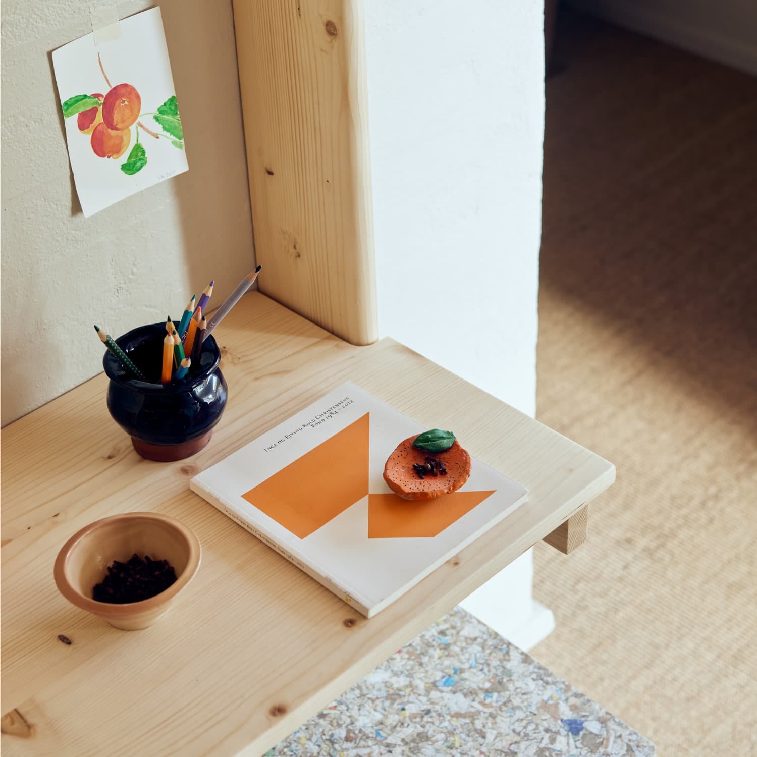 De karakteristiske H-formede enderammene viser frem det vakre åremønsteret i treverket og gir hyllen en tydelig arkitektonisk karakter. Rammene omfavner hyllene på en elegant måte, med avrundede detaljer som fremhever håndverket. Produsert i lokalt høstet furu fra Bosnia, er dette et bærekraftig alternativ til tradisjonelle, langsomtvoksende tresorter. En ultramatt lakk beskytter treet, samtidig som det naturlige uttrykket bevares.