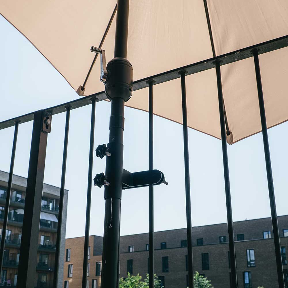 Parasollbeslag spesialutviklet for å sikre stabilt feste av parasollen. Parasollbeslaget er laget i galvanisert stål med matt svart pulverlakk. Med dette parasollbeslaget frigir du plass på din balkong. Solid og sikkert feste til din parasoll. Parasollstangen kan være opp til Ø18-40 mm for å passe til dette feste. Passer til rekkverk opptil 5 cm tykke. Max 13 cm mellom hvert rekkverk. Ved større parasoller anbefaler vi å bruke to beslag for enda sikrere feste.