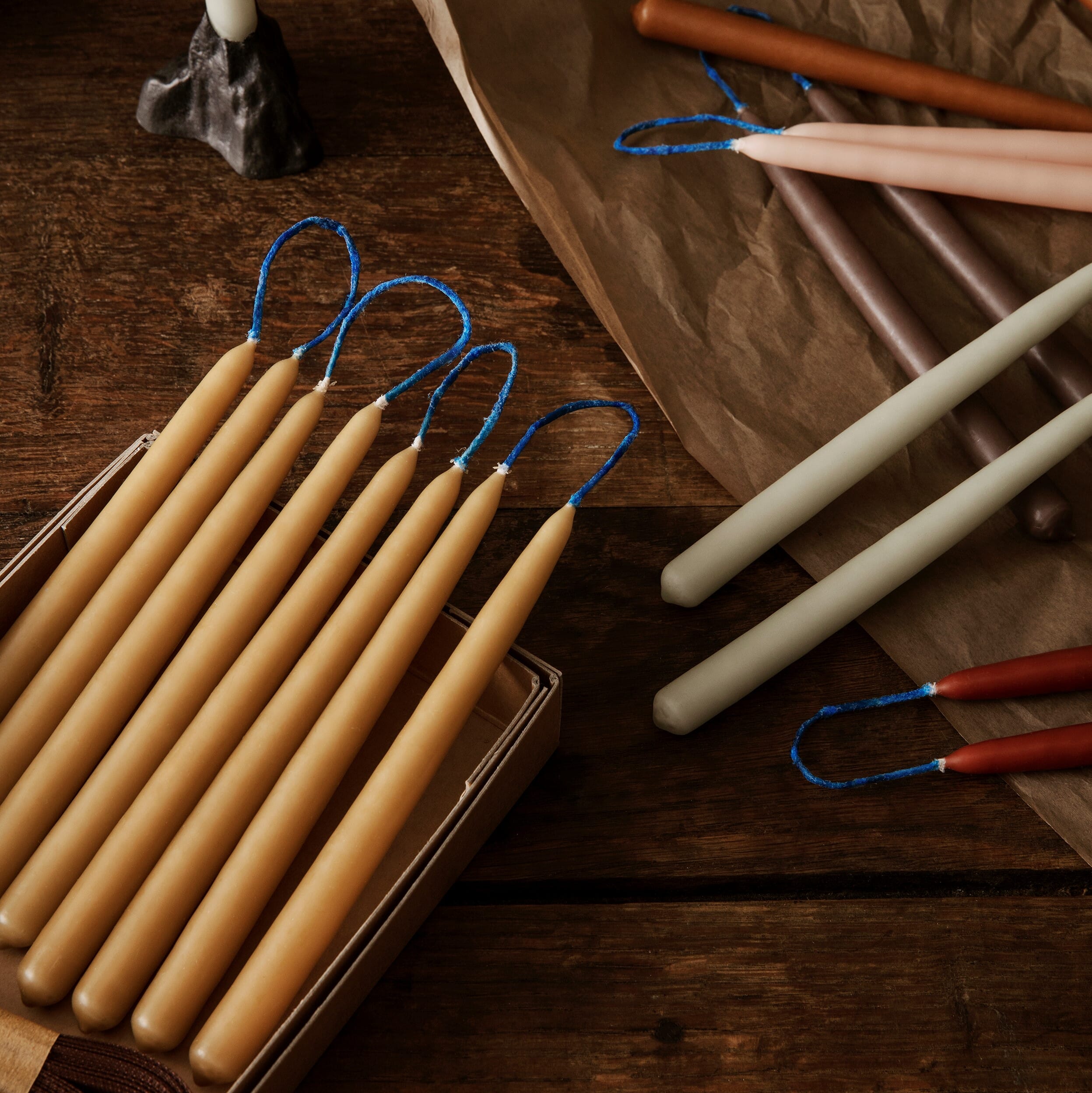 Dette settet med hånddyppede stearinlys har en karakteristisk blå veke og er tilgjengelig i en flere lekre høstinspirerte farger.