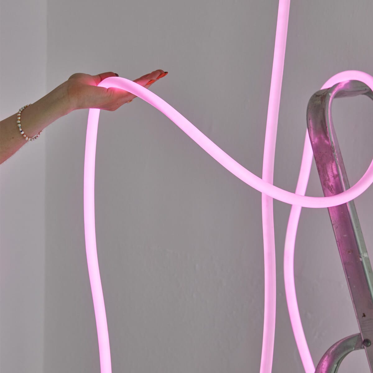 Flex Tube er en allsidig lampe som kan brukes som vegg-, bord- eller taklampe. Den kan formes i flytende bevegelser over et spisebord eller draperes langs en vegg for å skape unike mønstre. Takket være fleksibel LED-neon og rørstrukturen, er det mulig å lage både kunstneriske og funksjonelle belysningsløsninger som tilpasses dine behov.
