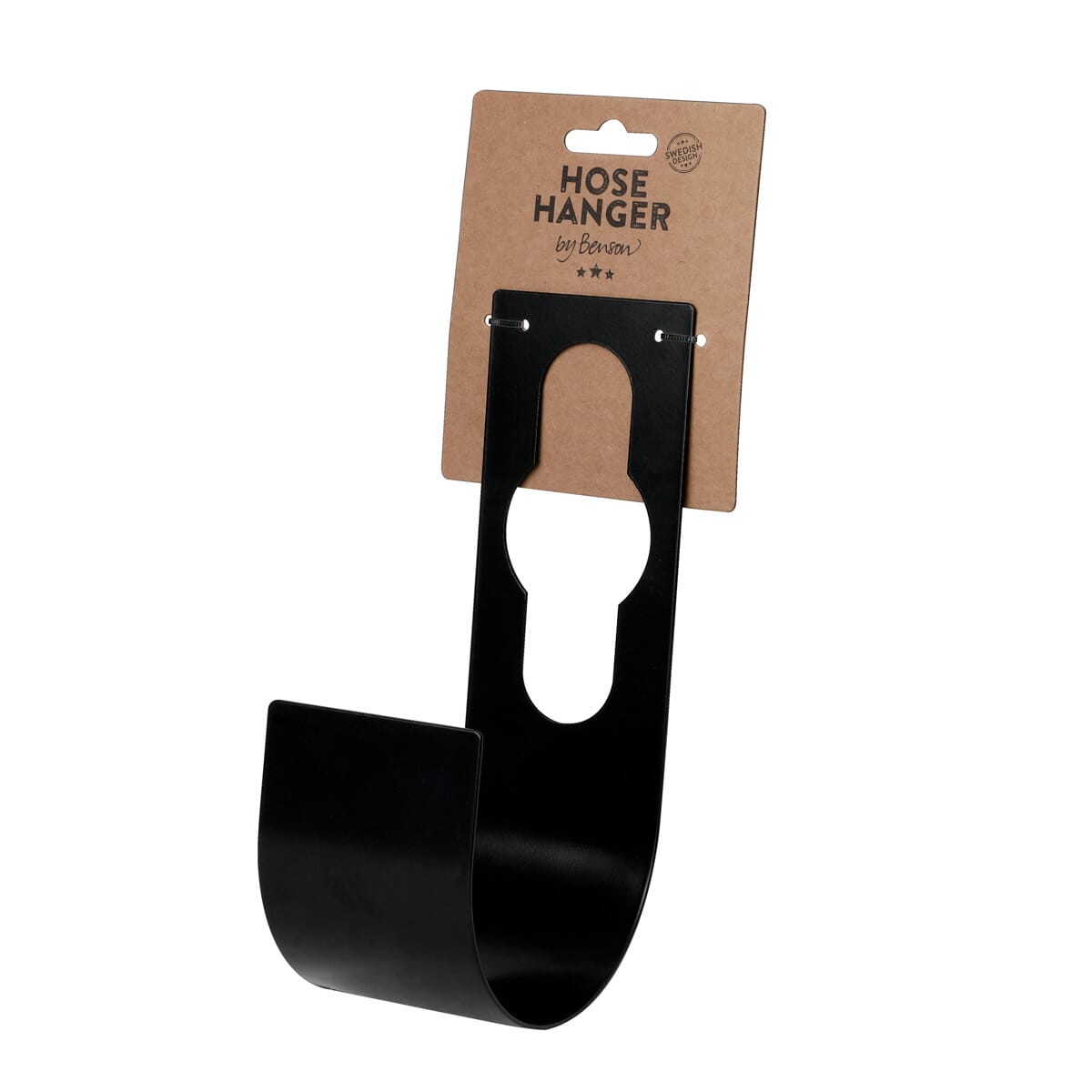 Praktisk oppheng til hageslange laget av 'By Benson'. Den kan henges på en kran eller festes direkte på veggen.