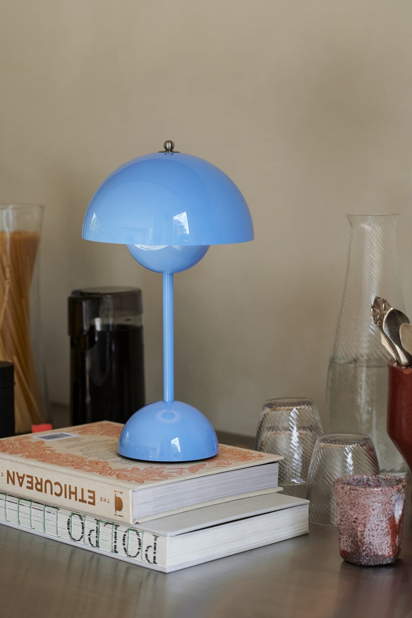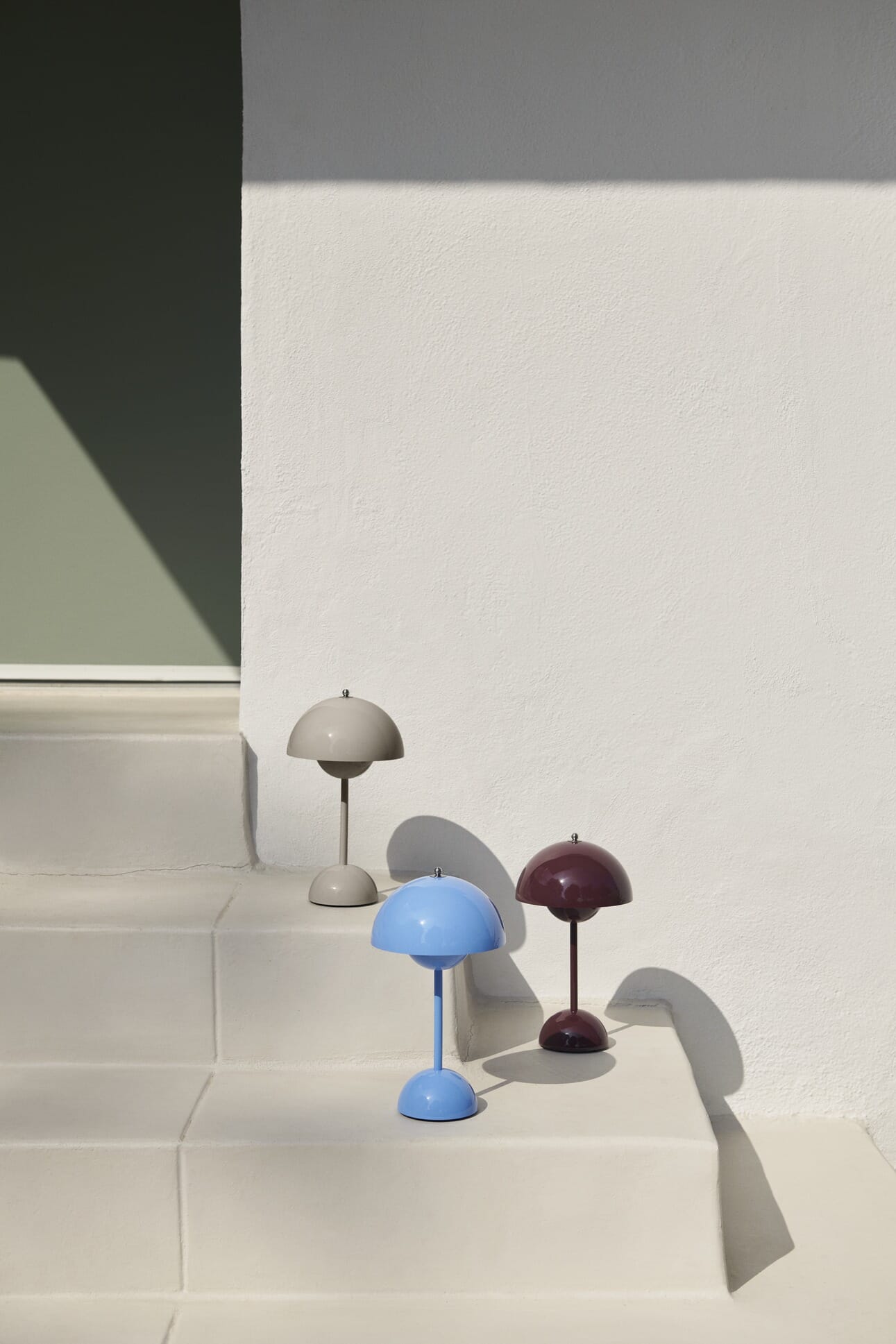 Blant de mest banebrytende danske designene på 1960-tallet, finer vi den ikoniske formen til Verner Pantons flowerpot-lamper. Den oppladbare VP9-lampen er litt mindre i størrelsen enn bordlampeversjonen, og bevisst lett og bærbar.