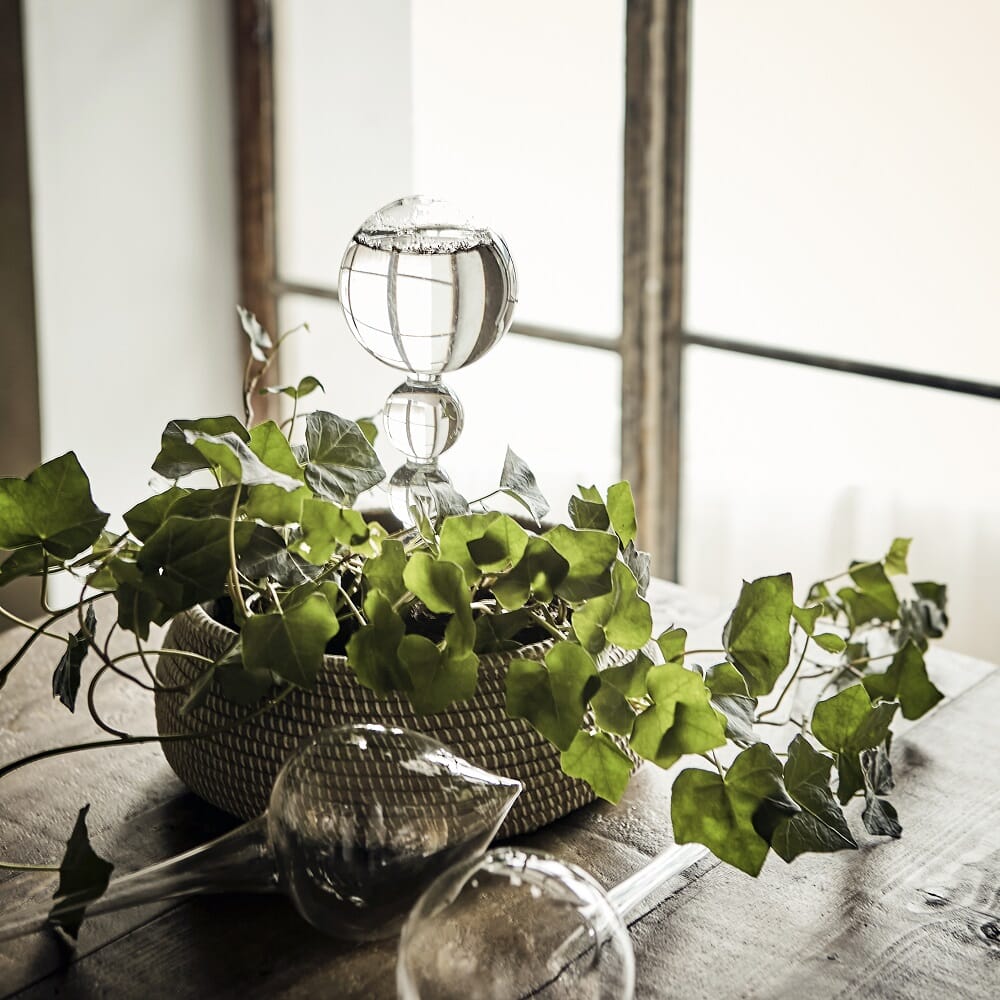 Munnblåst selvvanningsglass i klart glass. Fyll glassboblen med vann og stikk den direkte i jorden. Jorden vil trekke til seg så mye som den har behov for. Ikke bare er glasskulen dekorativ i potten, men praktisk i det daglige og når du skal på kortere ferier. Når glasset er tomt, fyller du bare på med nytt vann. Enkelt og greit.