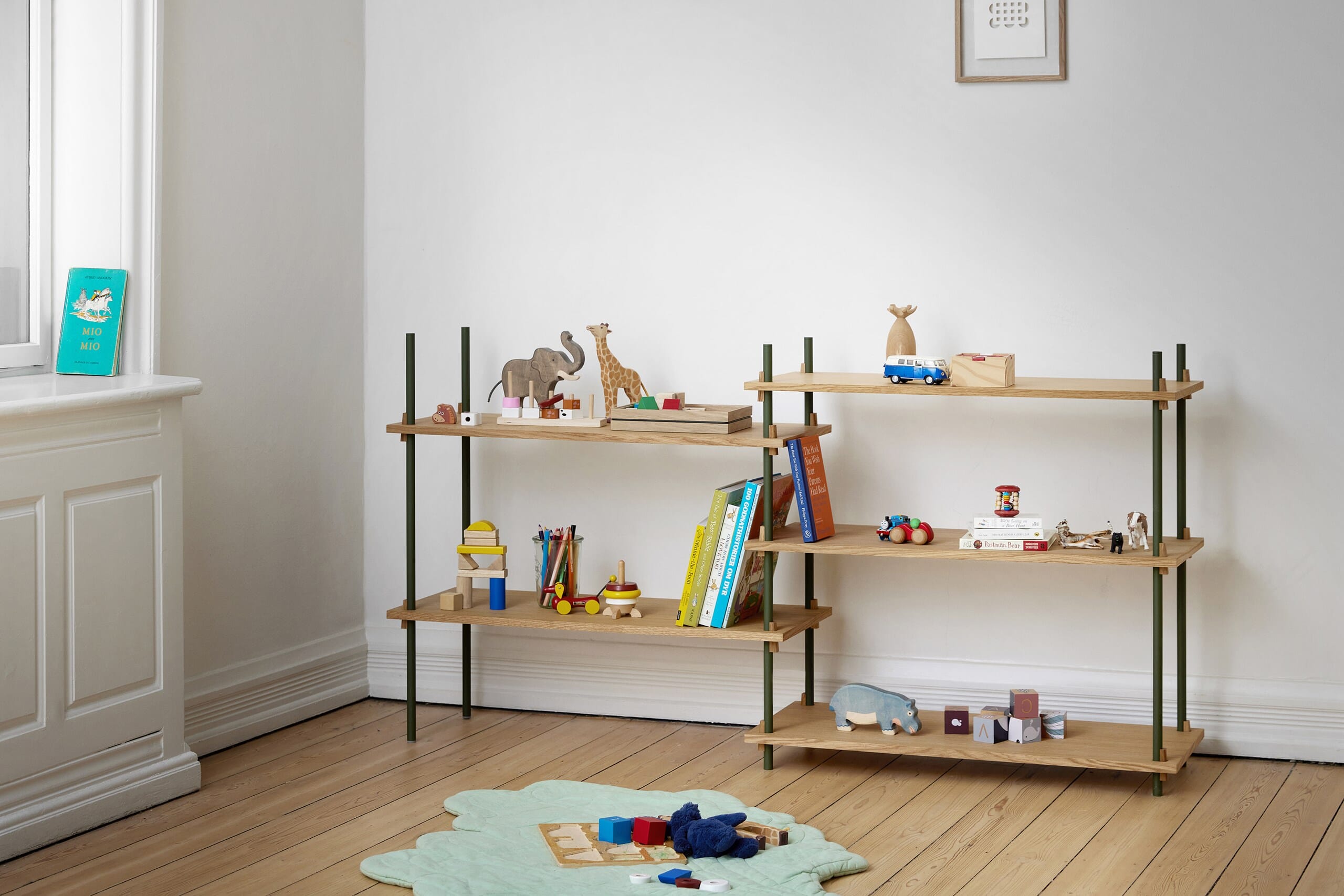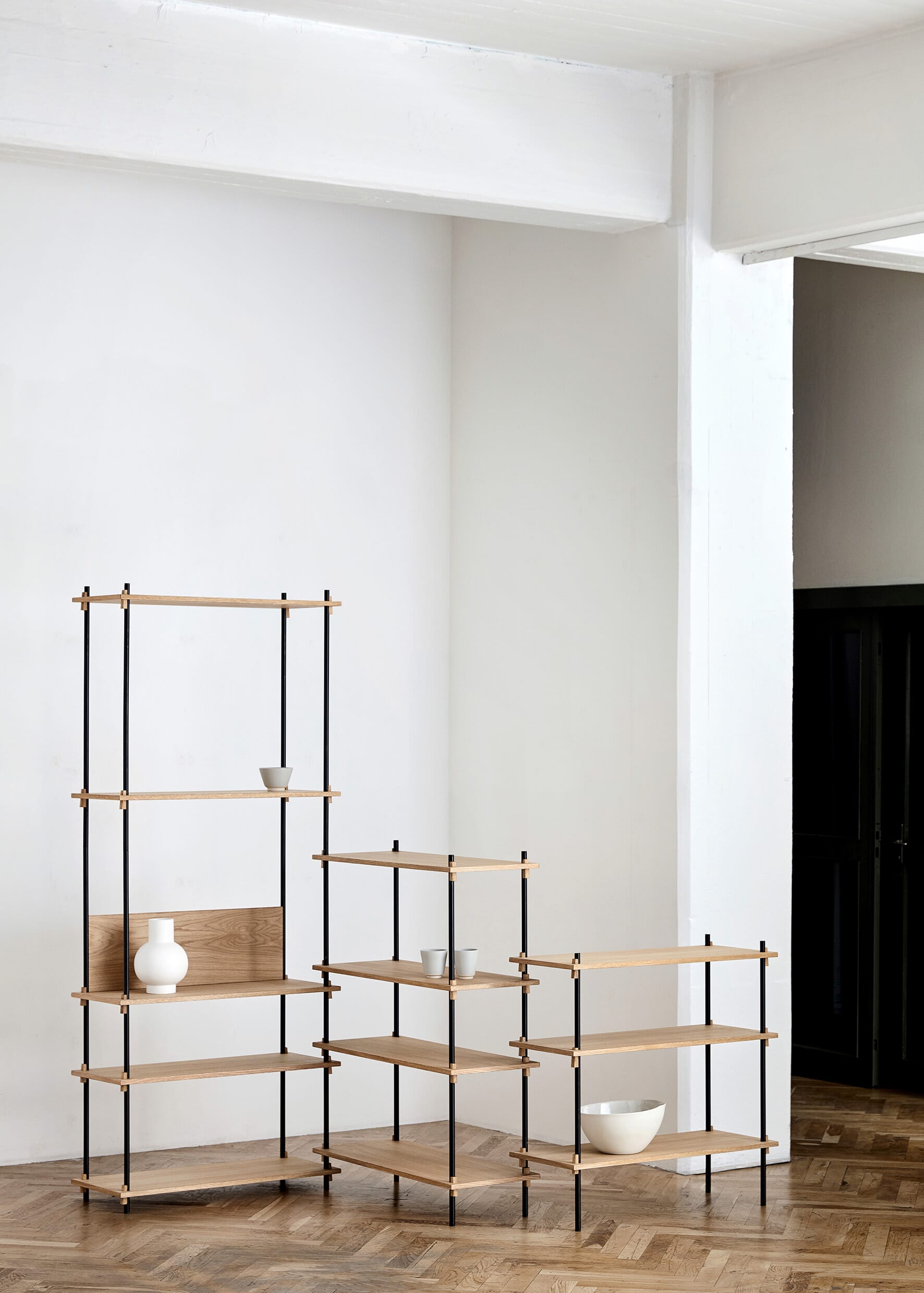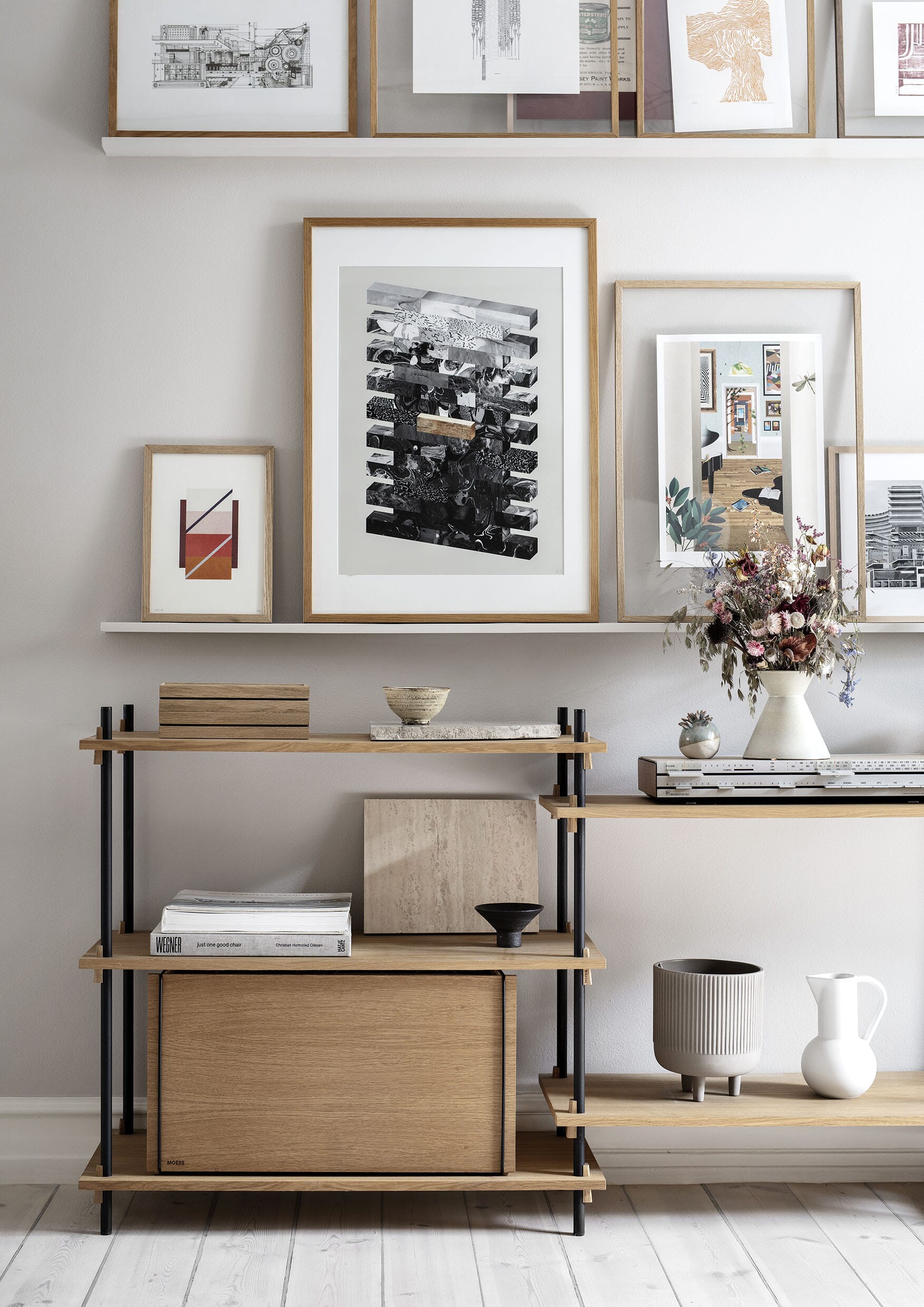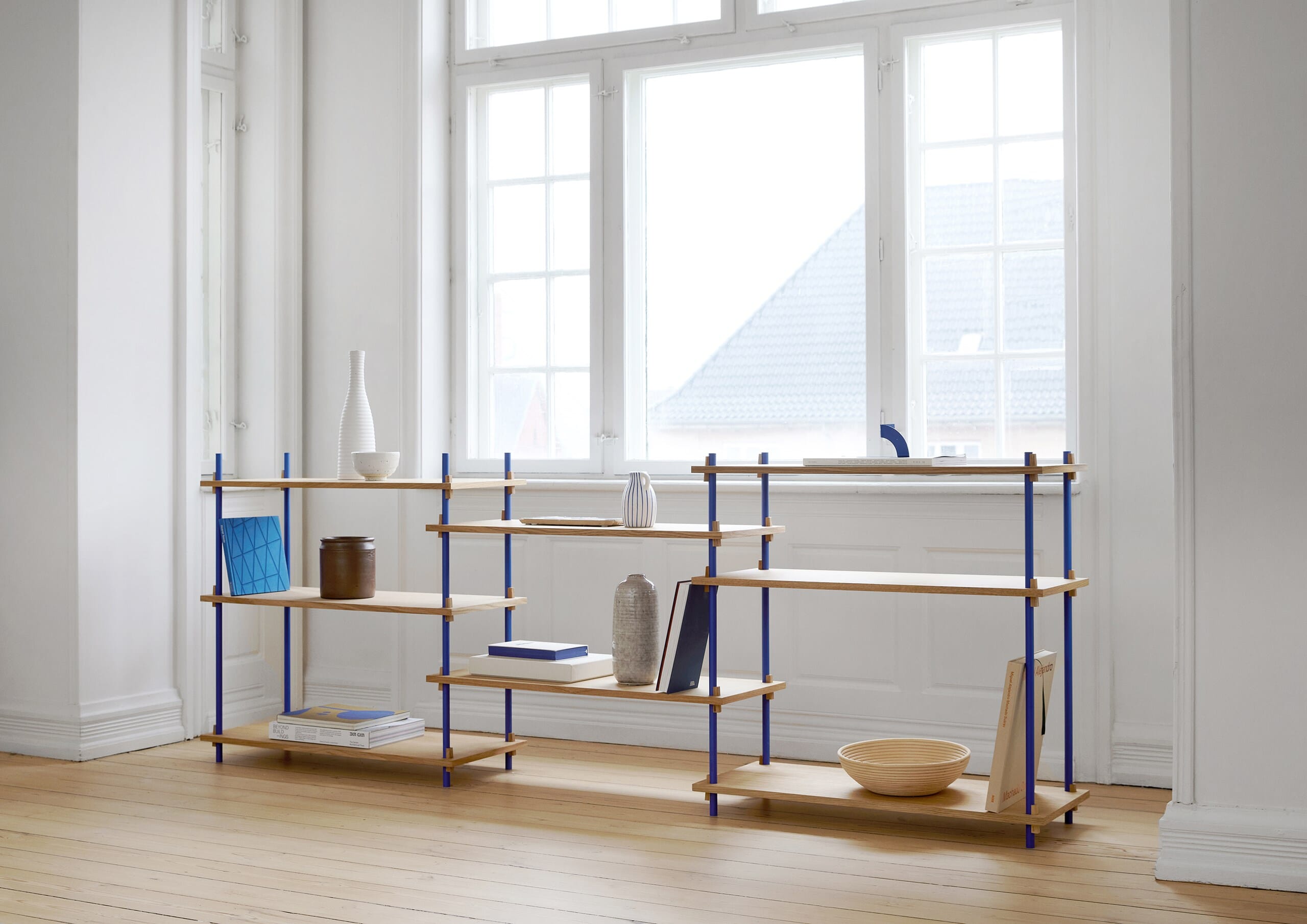 Hyllesystemet fra Moebe gir deg full frihet til å bygge ditt eget møbel som passer akkurat ditt behov. Hylle systemet kan bygges så høyt du vil og så langt du vil, bygg i forskjellig høyder eller rundt hjørner. Den unike konstruksjonen som karakteriserer systemet gjør at du selv kan bestemme om systemet skal brukes som romdeler eller mot en vegg, og kilene som holder hyllene på plass gjør at du selv bestemmer høyden på hver enkelt hylleplate.