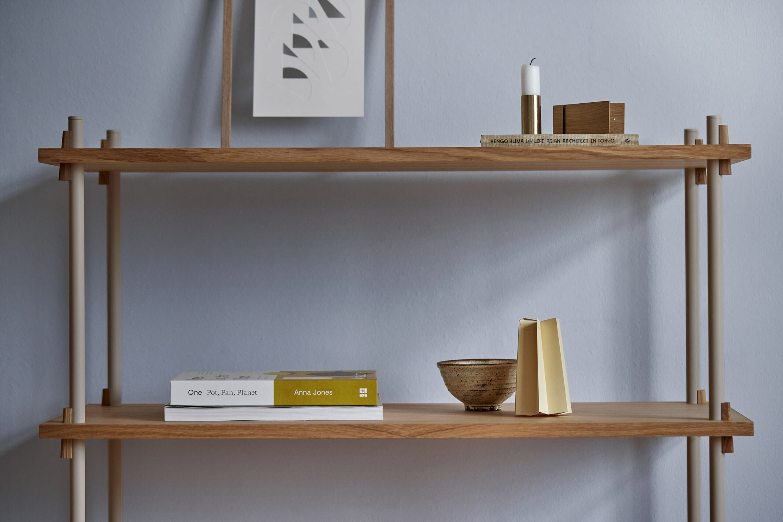 Frittstående hyllesystem. Hyllen kan utvides og tilpasses etter behov.