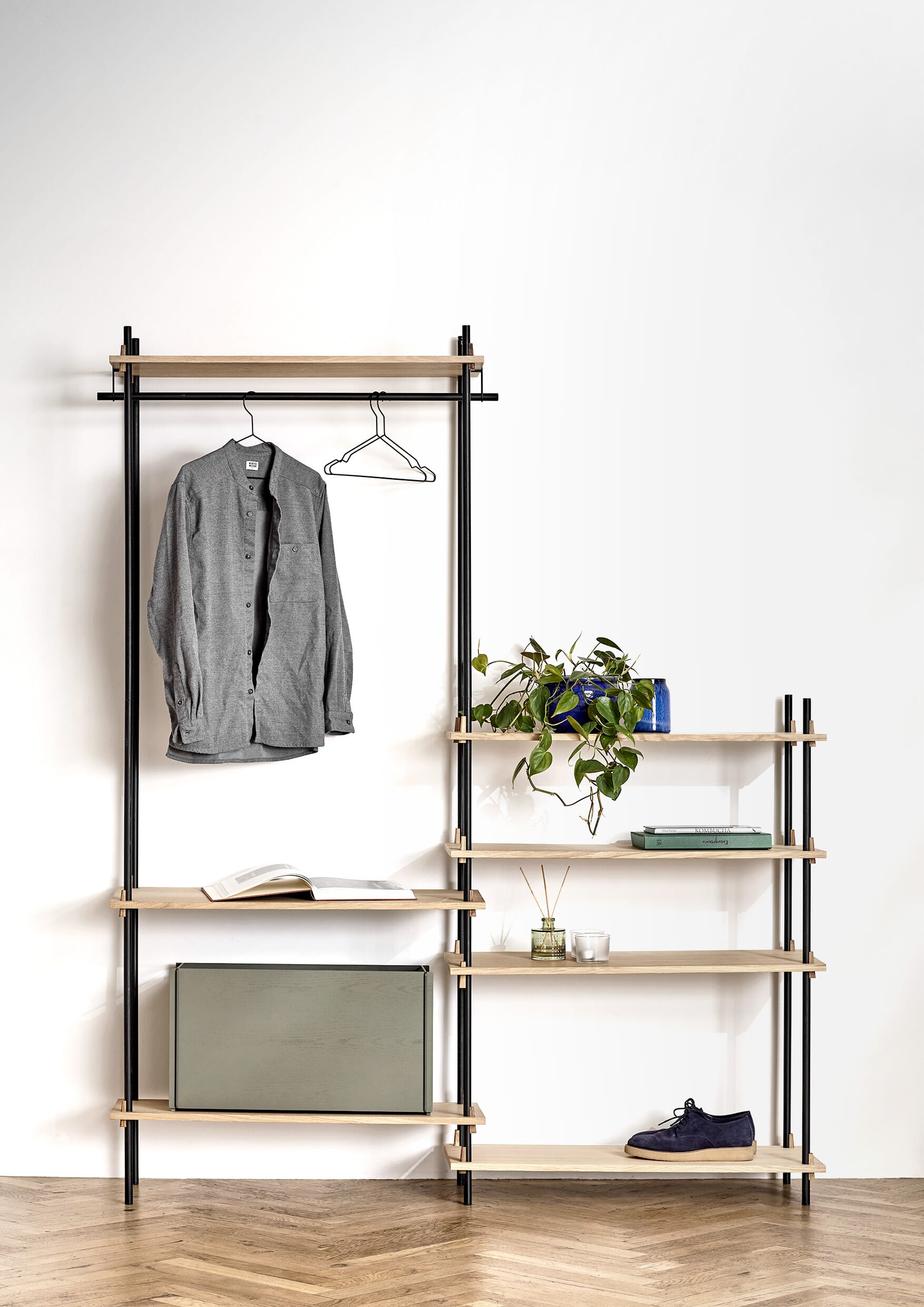 Hyllesystemet fra Moebe gir deg full frihet til å bygge ditt eget møbel som passer akkurat ditt behov. Hylle systemet kan bygges så høyt du vil og så langt du vil, bygg i forskjellig høyder eller rundt hjørner. Den unike konstruksjonen som karakteriserer systemet gjør at du selv kan bestemme om systemet skal brukes som romdeler eller mot en vegg, og kilene som holder hyllene på plass gjør at du selv bestemmer høyden på hver enkelt hylleplate.