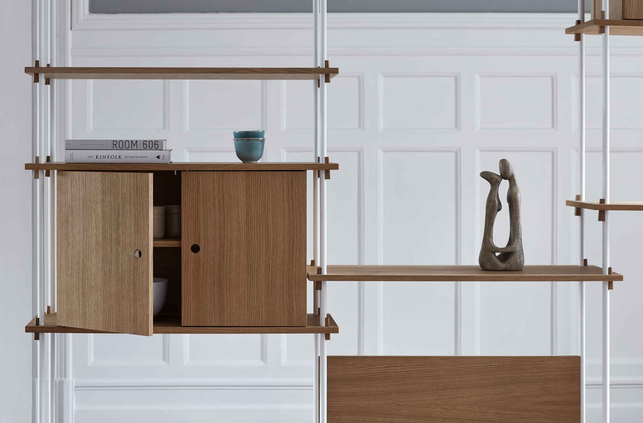 Hyllesystemet fra Moebe gir deg full frihet til å bygge ditt eget møbel som passer akkurat ditt behov. Hylle systemet kan bygges så høyt du vil og så langt du vil, bygg i forskjellig høyder eller rundt hjørner. Den unike konstruksjonen som karakteriserer systemet gjør at du selv kan bestemme om systemet skal brukes som romdeler eller mot en vegg, og kilene som holder hyllene på plass gjør at du selv bestemmer høyden på hver enkelt hylleplate.