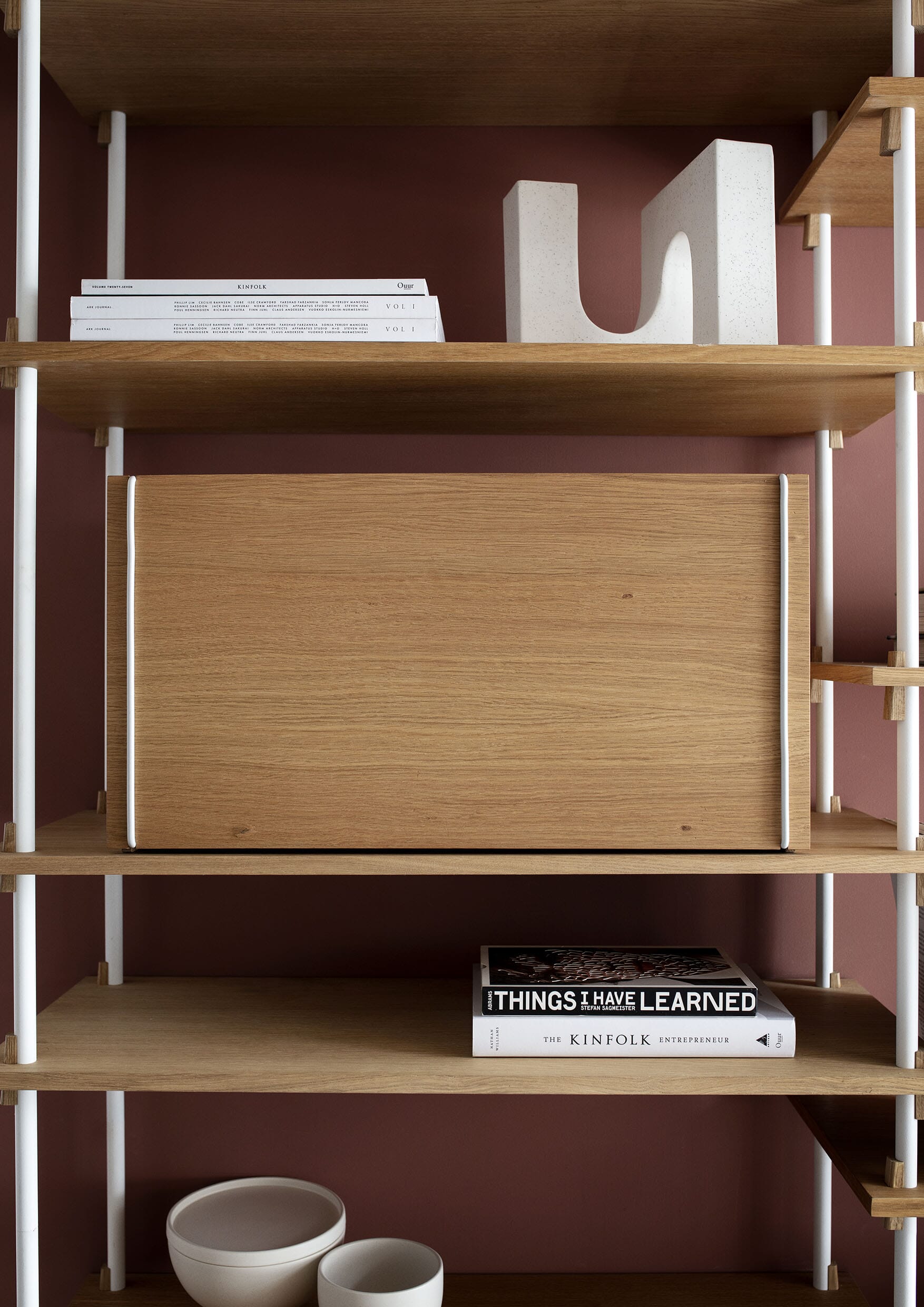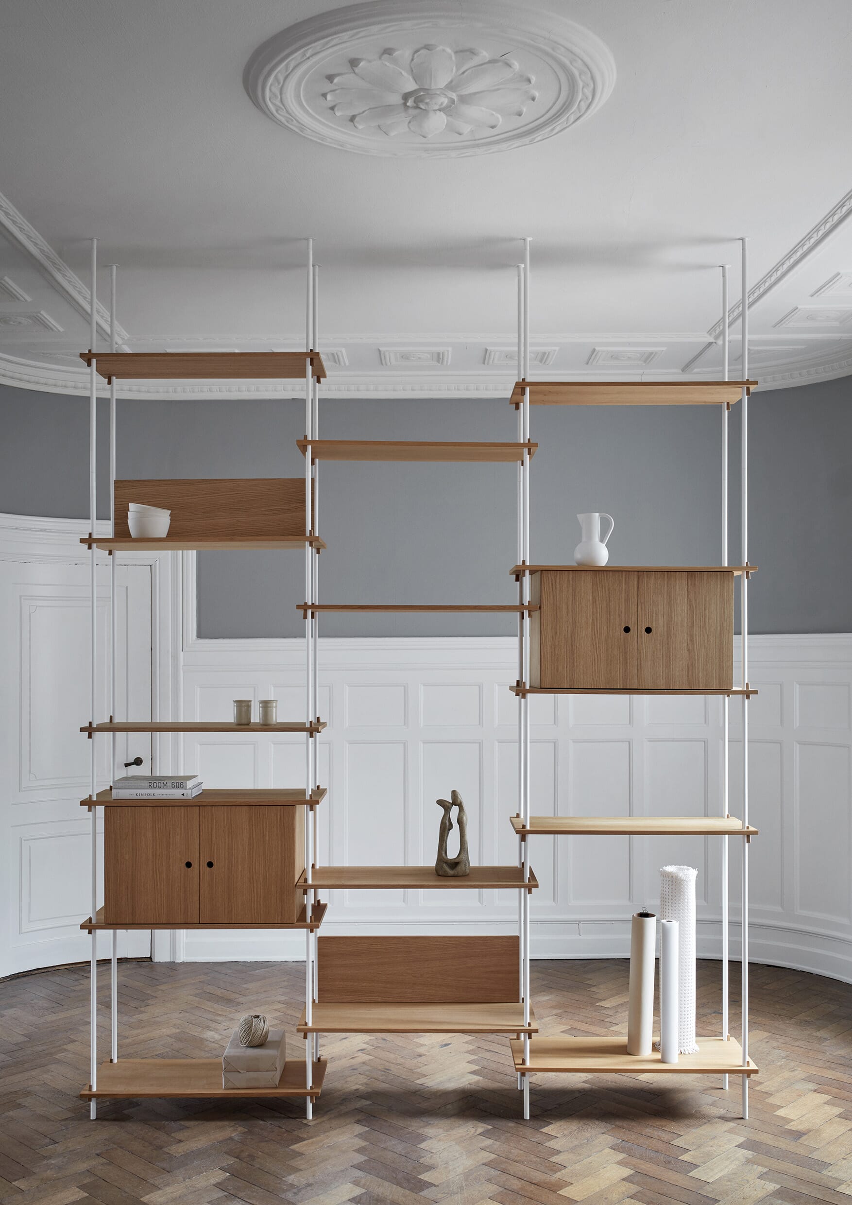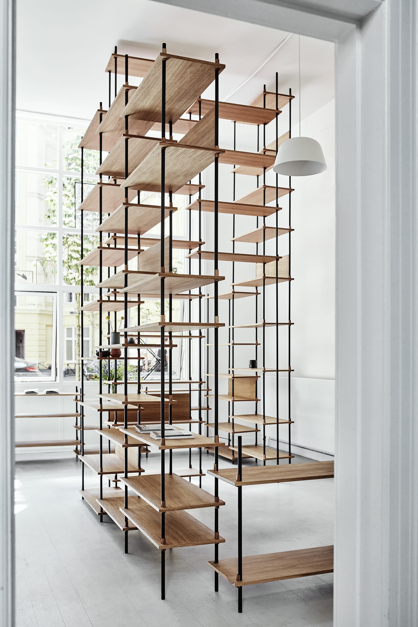 Hyllesystemet fra Moebe gir deg full frihet til å bygge ditt eget møbel som passer akkurat ditt behov. Hylle systemet kan bygges så høyt du vil og så langt du vil, bygg i forskjellig høyder eller rundt hjørner. Den unike konstruksjonen som karakteriserer systemet gjør at du selv kan bestemme om systemet skal brukes som romdeler eller mot en vegg, og kilene som holder hyllene på plass gjør at du selv bestemmer høyden på hver enkelt hylleplate.