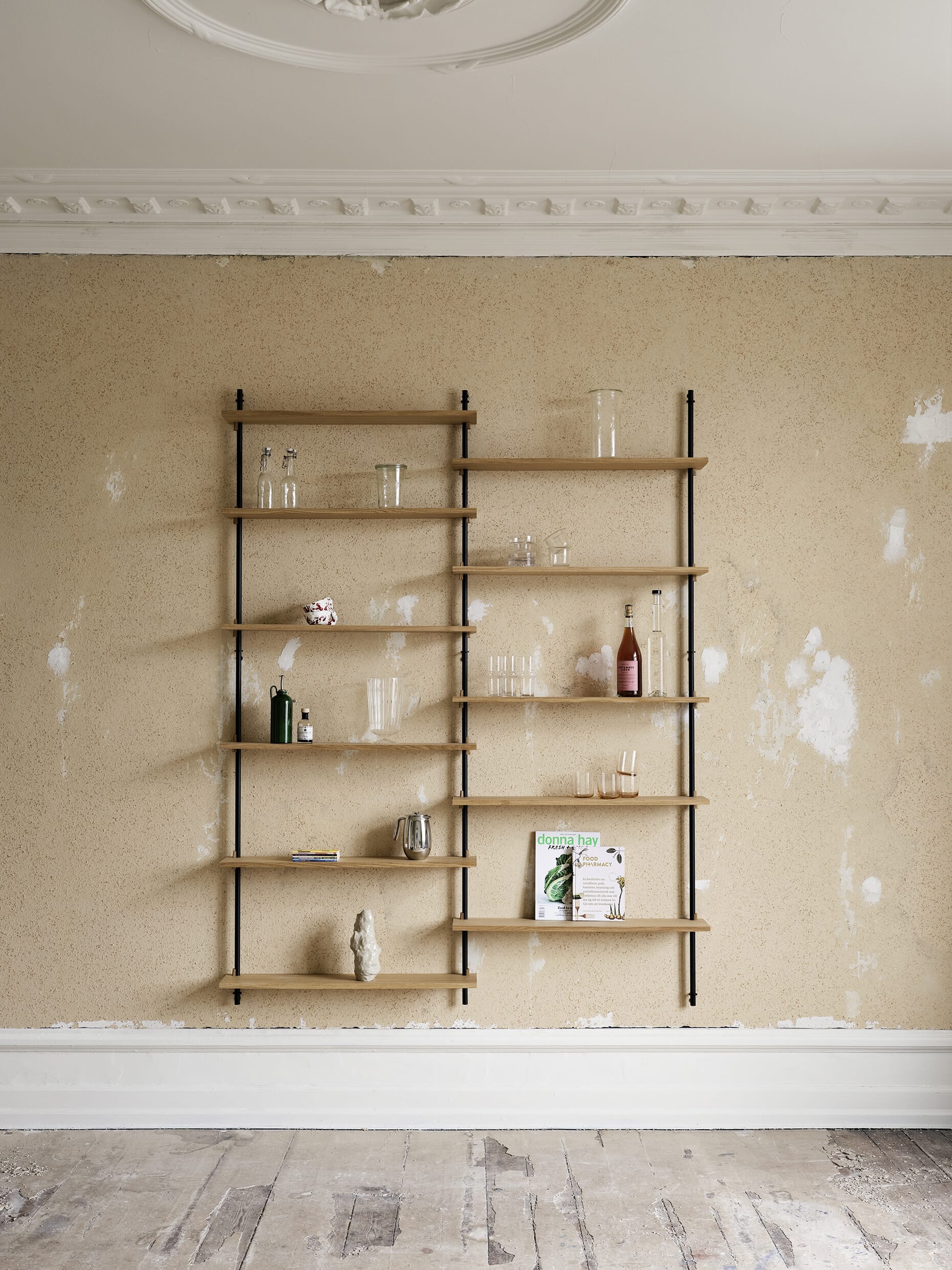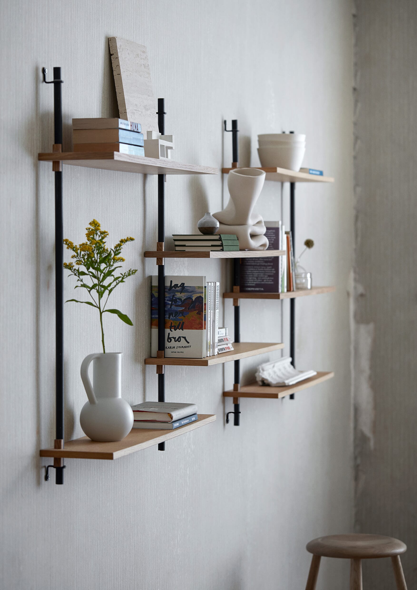 Vegghengt hyllesystem fra Moebe. Hyllen kan utvides og tilpasses etter behov.