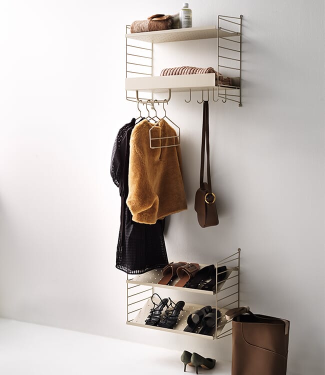 Del kombinasjonen til gangen din opp i to og bygg på med kroker og stenger til yttertøyet og perforerte skohyller på gavler til vegg. Denne løsningen fra String® vil sørge for å holde gangen din både ryddig og stilig.