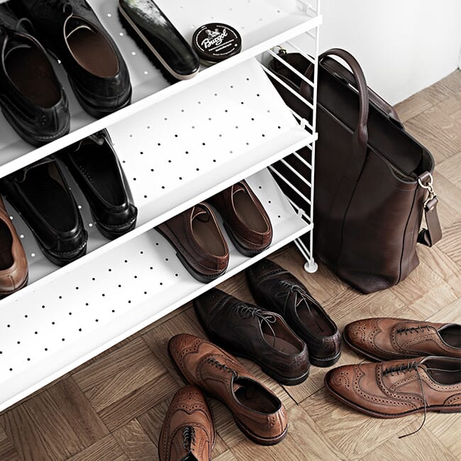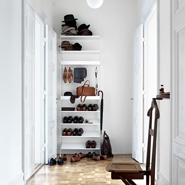 For den mellomstore gangen har vi denne løsningen fra String® som tilbyr alle de funksjonene du måtte trenge. Metallhyller med høy kant øverst, metallhyller med lav kant under inkludert ekstra stang til yttertøyet ditt. Perforerte skohyller i bunnen med god plass til mange sko – alt i ett enkelt oppsett.