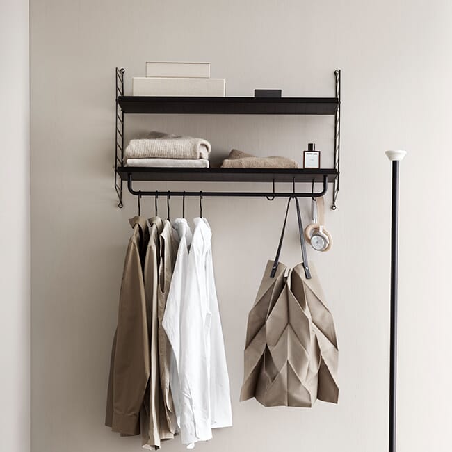 Selv små ganger fortjener en smart løsning. Denne vegghengte kombinasjonen fra String® med ekstra kroker og stenger gir deg flere oppbevaringsmuligheter enn du noen gang kunne drømt om i en trang og smal gang.