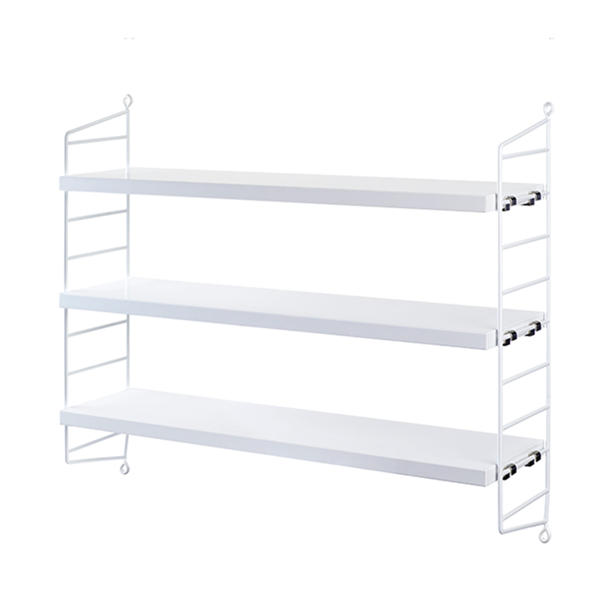 String Pocket er en komplett hylle med to gavler og tre hylleplater. Du kan velge blant en rekke farger og materialer. Flere hyller kan kombineres på mange forskjellige måter. Med én pakke får du én hylle, med to pakker kan du bygge opp til tre seksjoner, eller bygge hyllen opp i høyden.