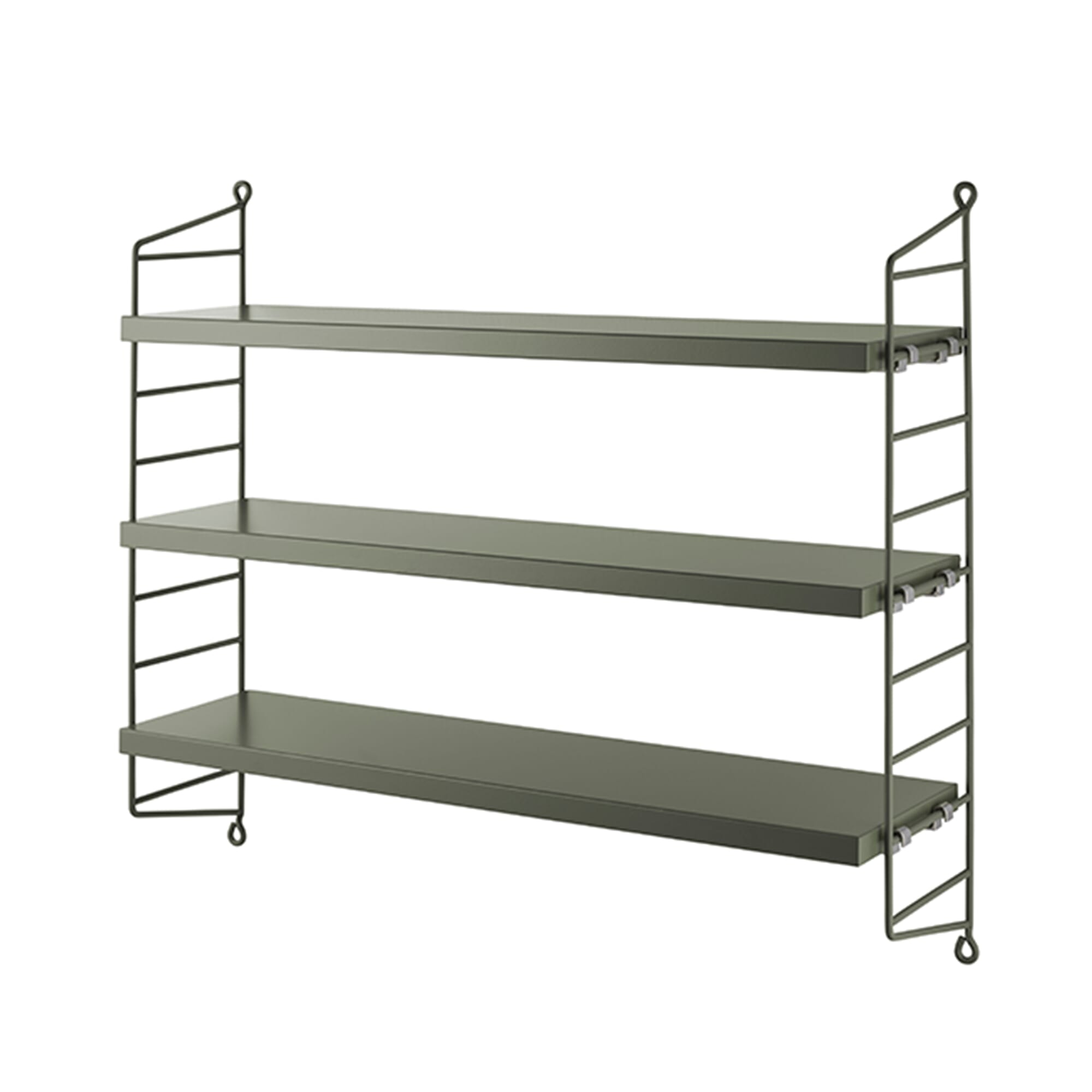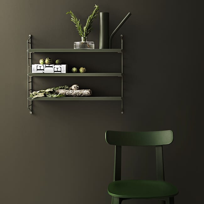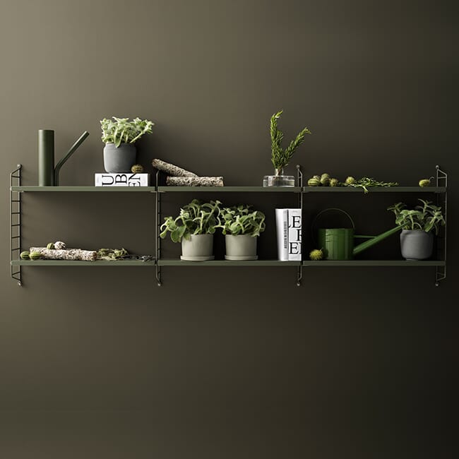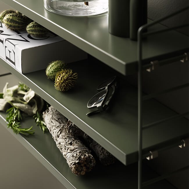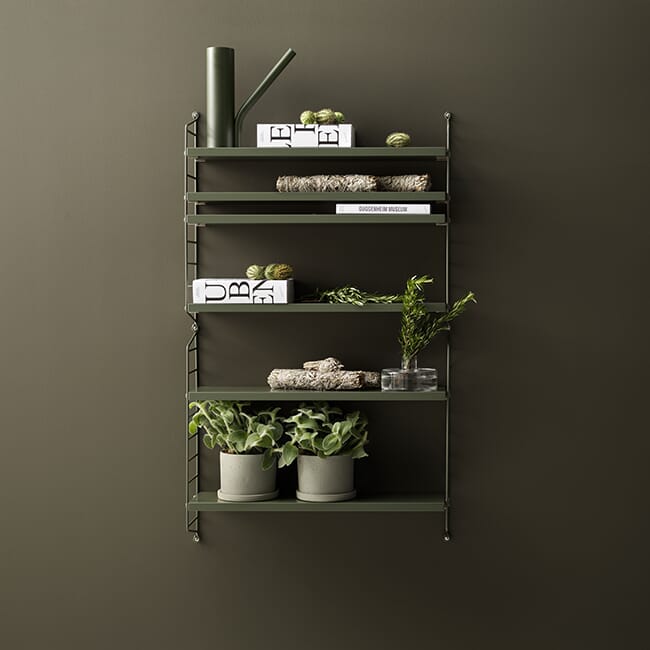 String Pocket er en komplett hylle med to gavler og tre hylleplater. Du kan velge blant en rekke farger og materialer. Flere hyller kan kombineres på mange forskjellige måter. Med én pakke får du én hylle, med to pakker kan du bygge opp til tre seksjoner, eller bygge hyllen opp i høyden.