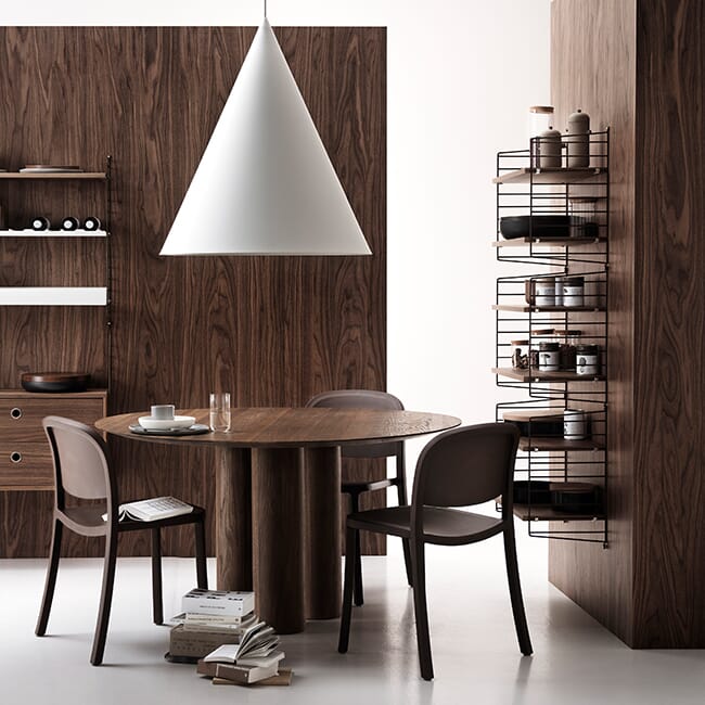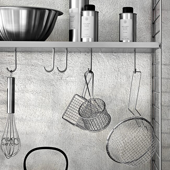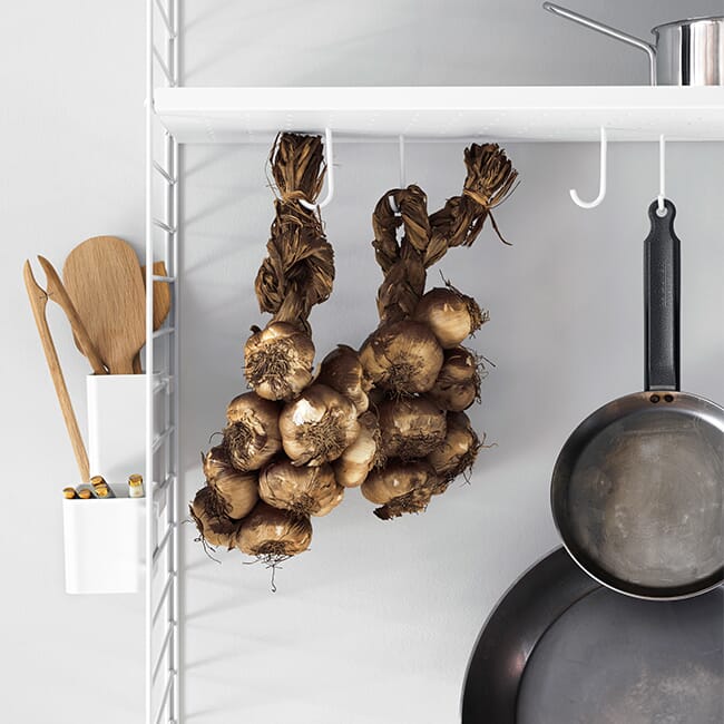 Denne vegghengte løsningen fra String® med metallhyller i to seksjoner, er perfekt for oppbevaring av kjøkkenutstyr. Bruk krokene til å henge opp diverse kjøkkenutstyr eller kjøkkenhåndklær.