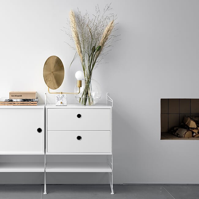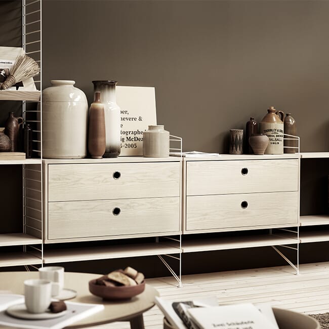 Materiale: Lakkert stål, lakkert MDF. Tre finér på variantene eik, sortlakkert ask og valnøtt. Tre er et levende materiale og kan derfor naturlig endre utseendet sitt over tid, spesielt når overflaten blir eksponert for direkte sollys.