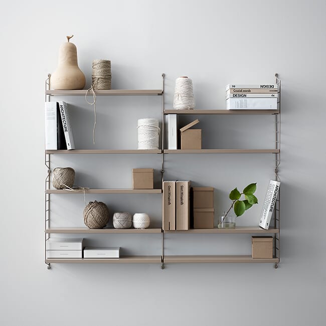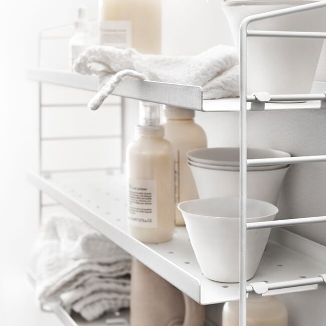 Når du trenger noe diskret og elegant, vil denne vegghengte 20 cm dype løsningen fra String® gjøre susen. De perforerte hyllene er den optimale basen for å være kreativ med tilbehøret vårt. Legg til kroker, stenger eller hengerstativer for å designe din egen unike hylle.