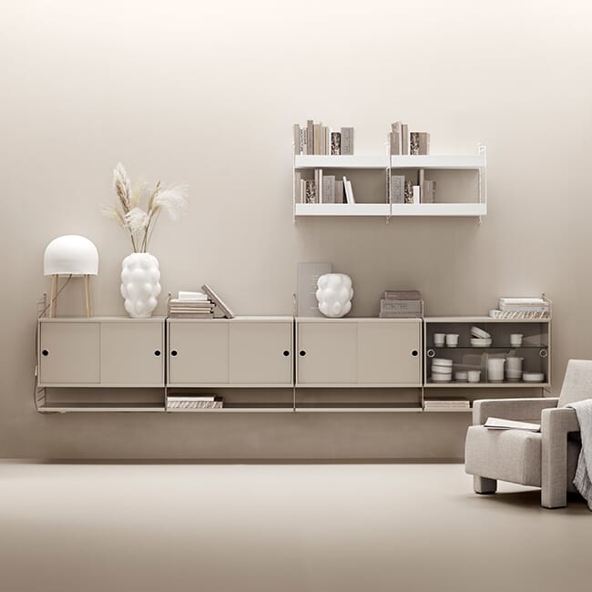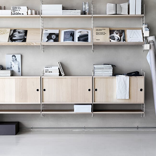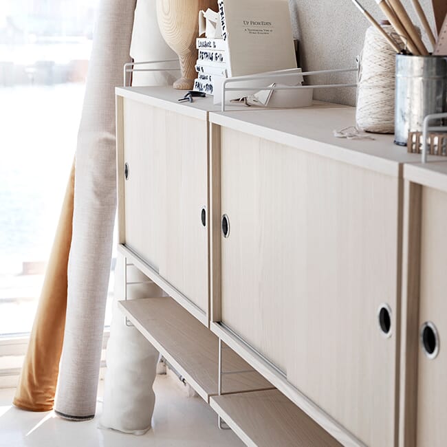 Materiale: Lakkert stål, lakkert MDF. Tre finér på variantene eik, sortlakkert ask og valnøtt. Tre er et levende materiale og kan derfor naturlig endre utseendet sitt over tid, spesielt når overflaten blir eksponert for direkte sollys.