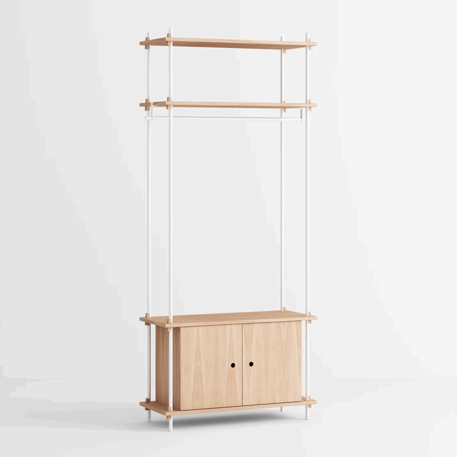 MOEBE Garderobesystem S.200.1.G kombinerer funksjon og fleksibilitet med nordisk eleganse. Dette gjennomtenkte garderobesystemet er en del av MOEBEs modulbaserte hyllesystem, og gir deg en komplett løsning for oppbevaring av klær og tilbehør – perfekt for både entré og soverom.