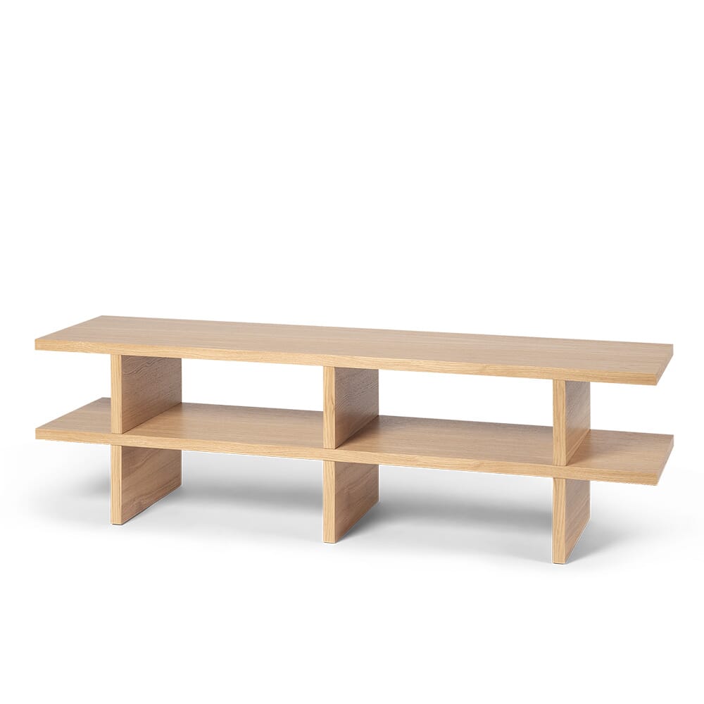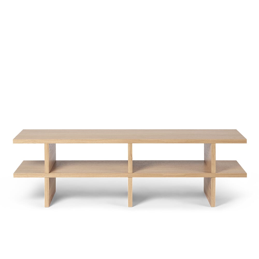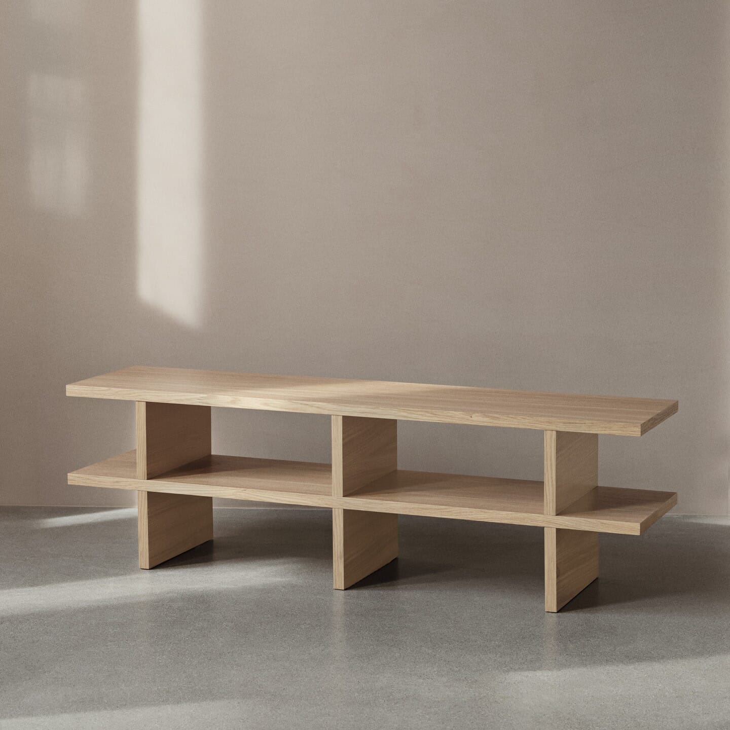 Stilfull og praktisk benk fra Ferm Living, tilhørende Kona-serien. Serien er inspirert av Japandi-estetikk, med funksjon og stil i fokus. Den er laget for å kunne tilpasse seg ulike behov i hjemmet ditt, enten den brukes som en bokhylle du kan sitte å lese favoritt bøkene dine på, eller som en skohylle i gangen hvor du kan sette deg ned for å ta på skoene. Den gjør seg også fin som en elegang lagringsløsning ved fotenden av sengen. Mulighetene er endeløse.