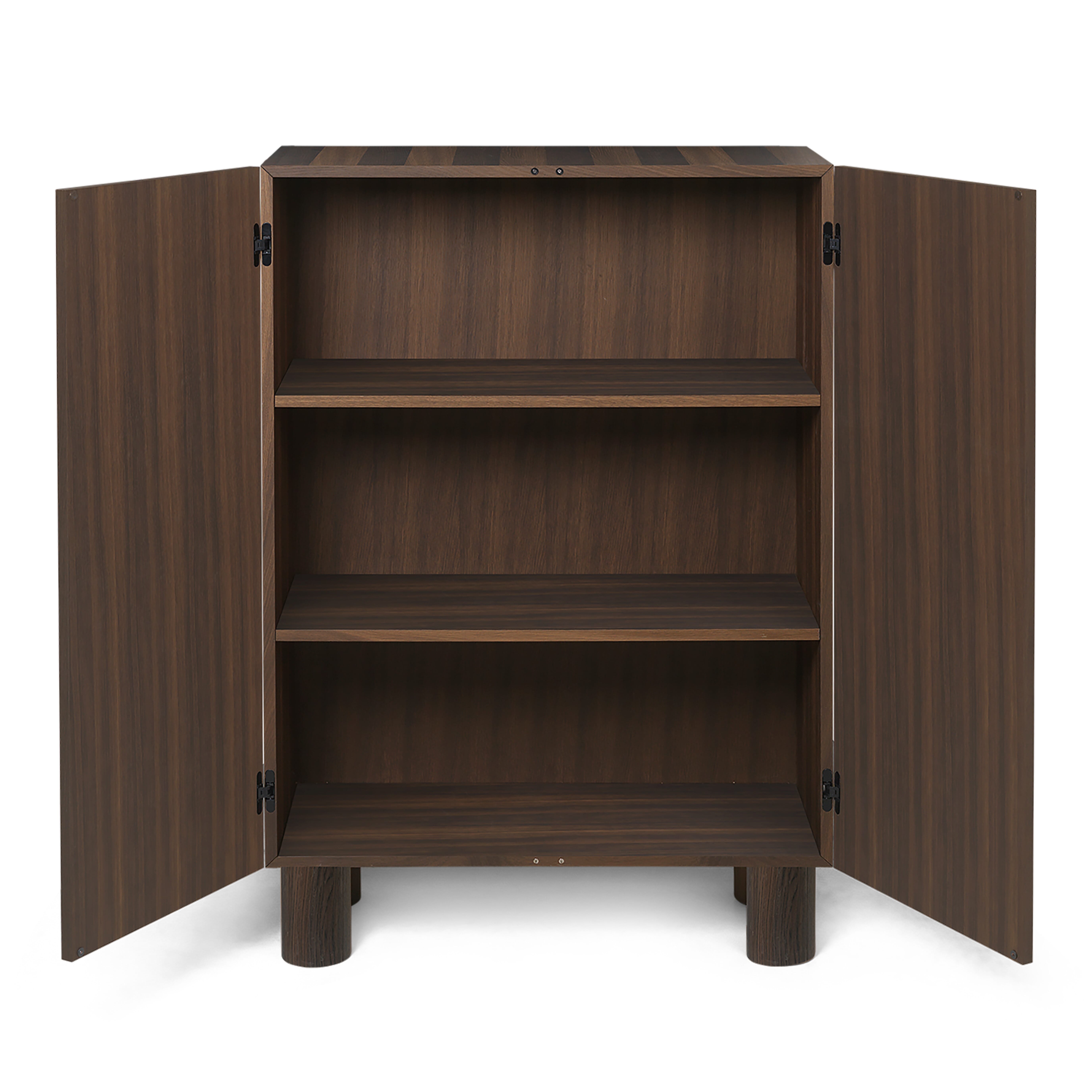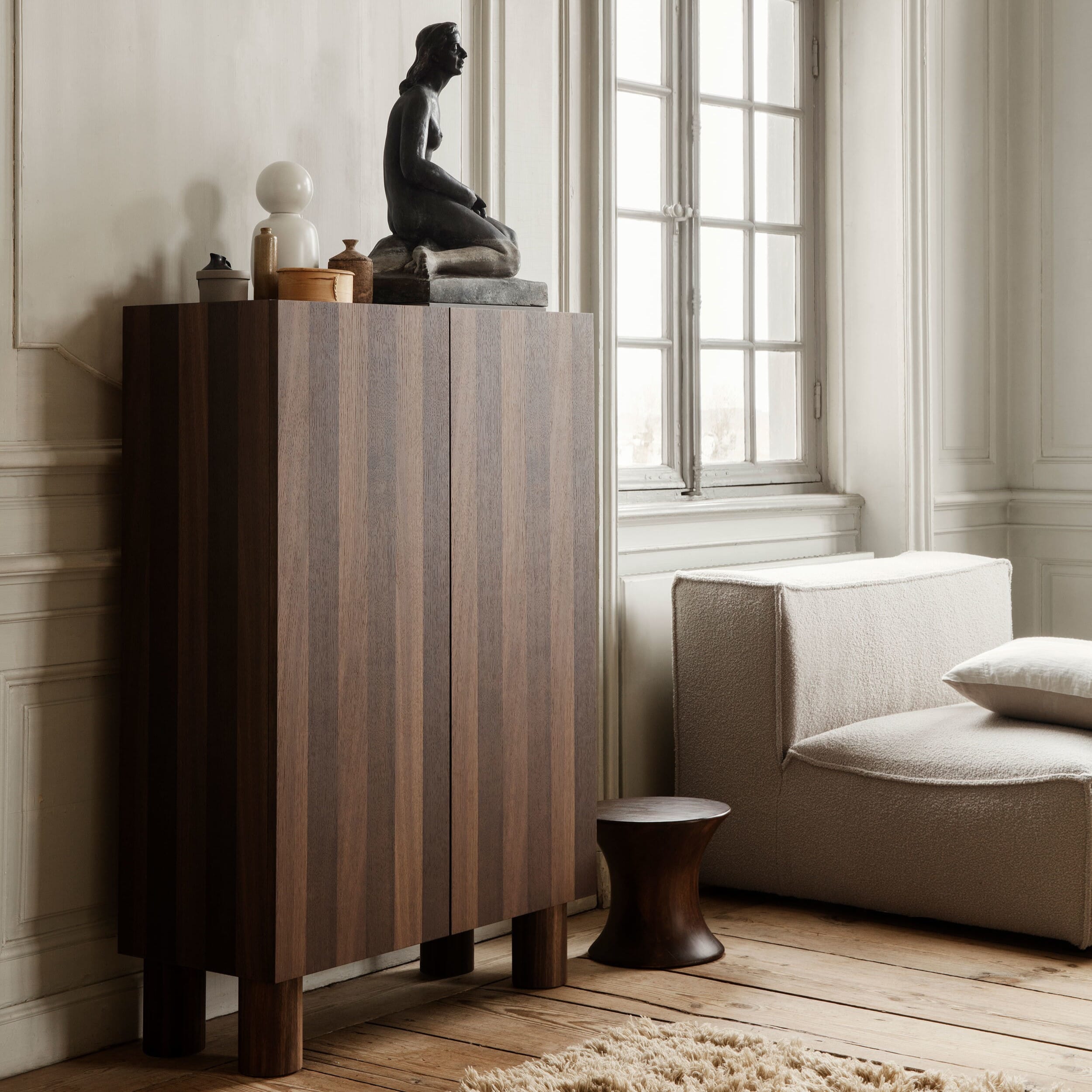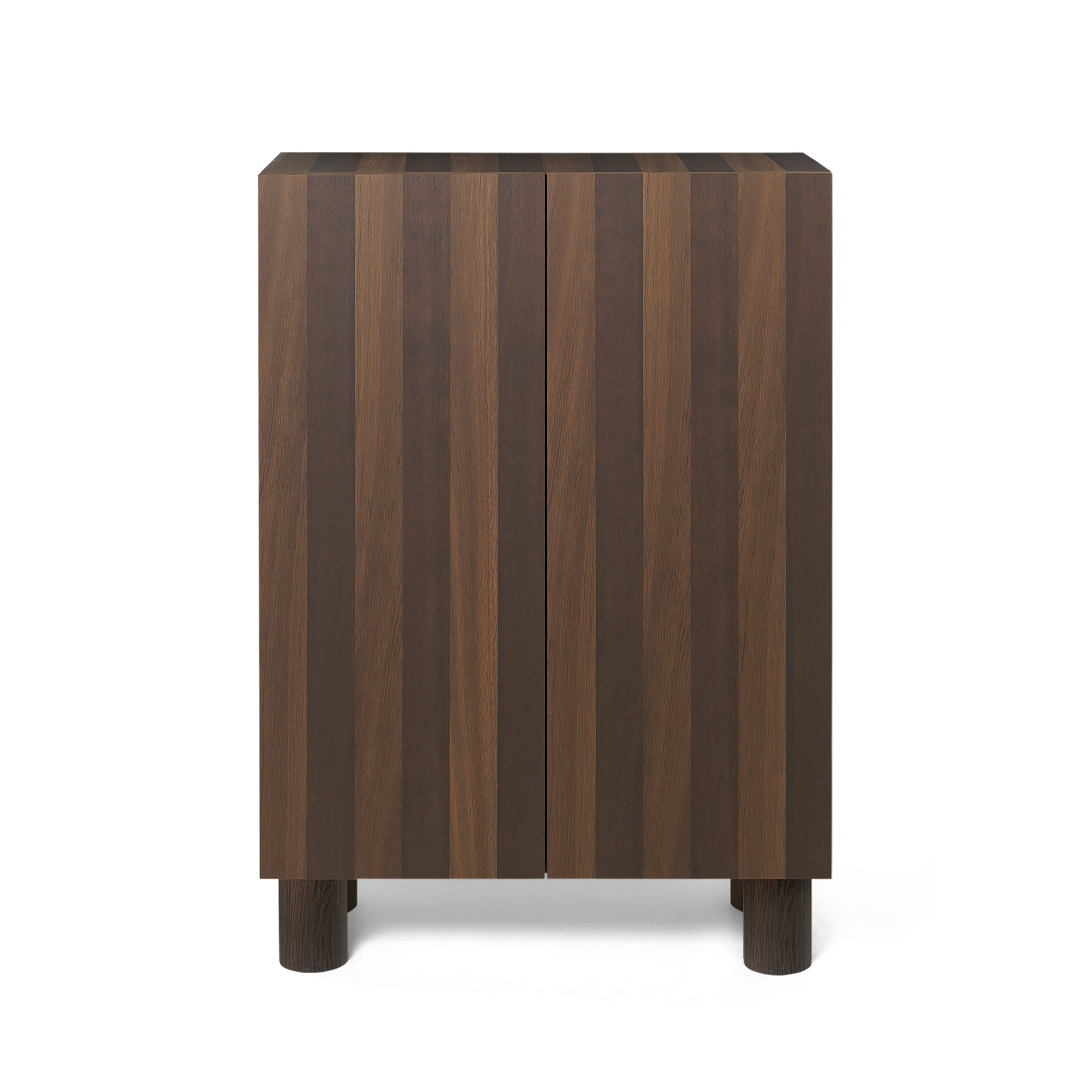 Inspirert av brutalisme, leker Post-skjenken fra Ferm Living med volumer for å presentere en bemerkelsesverdig oppbevaringsløsning med forseggjorte detaljer. Skapet er laget av FSC™ Mix-sertifisert tre, og har stripete tredetaljer i eikefiner som er oppnådd gjennom en intrikat og tidkrevende snekkerteknikk kjent som marquetry. For å bevare det enkle uttrykket til den stripete fronten, åpnes og lukkes skapdørene med en skjult mekanisme for å unngå synlige håndtak. Innvendig har skapet to hyller. Post-skjenken er en perfekt blanding av funksjonalitet og estetikk, og den er et stilig tillegg til ethvert hjem eller kontor.