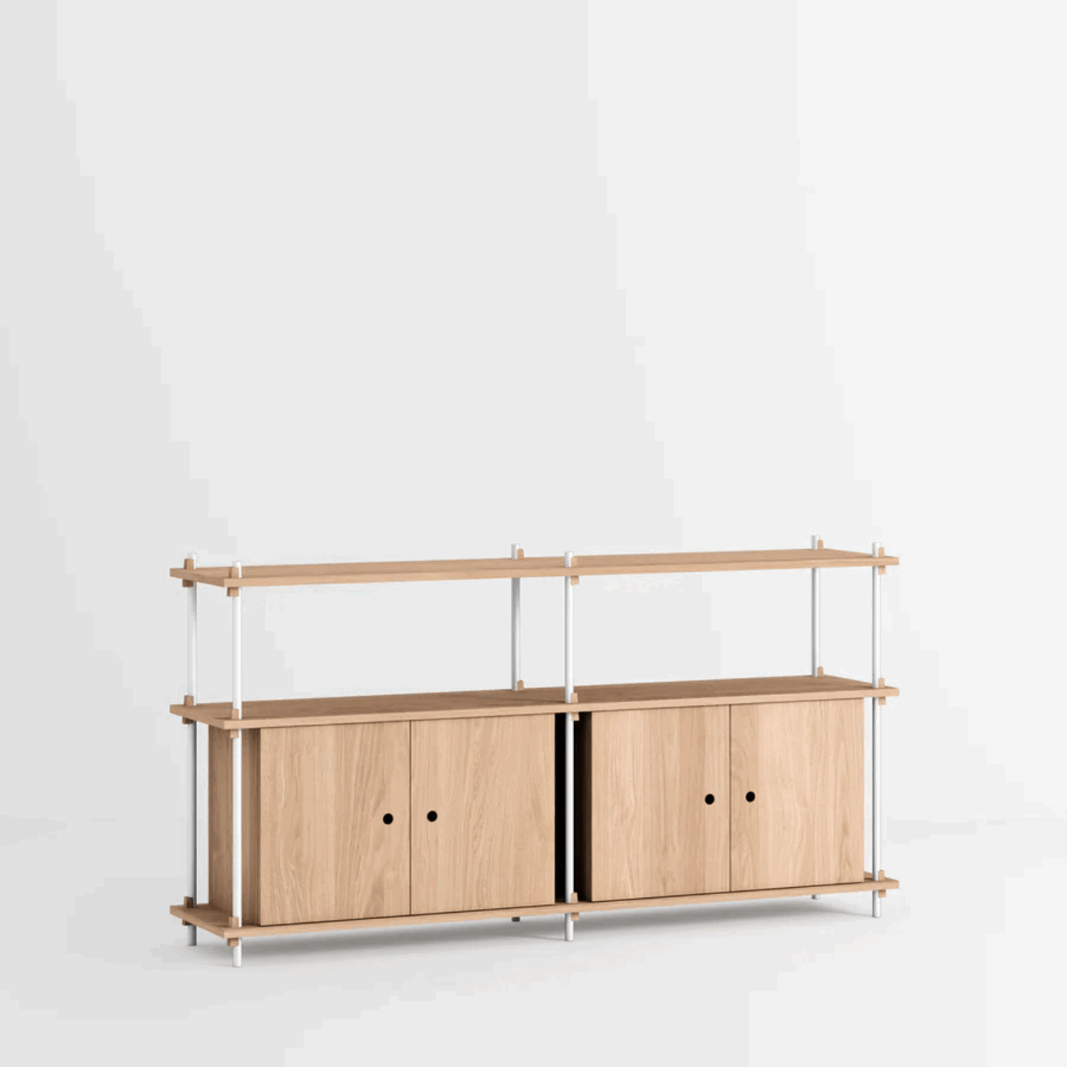 Den modulære skjenken består av et bredt dobbelskap og en åpen hylle over, noe som gir en perfekt balanse mellom skjult og synlig oppbevaring. Den lave høyden gjør den ideell under vinduer, i stuen som mediamøbel, eller i gangen for ryddig lagring. Skjenken er bygget i FSC-sertifisert eikefinér og understøttet av pulverlakkerte stålben, som sikrer både holdbarhet og estetisk appell. Og med MOEBEs system kan du når som helst utvide eller tilpasse løsningen videre.