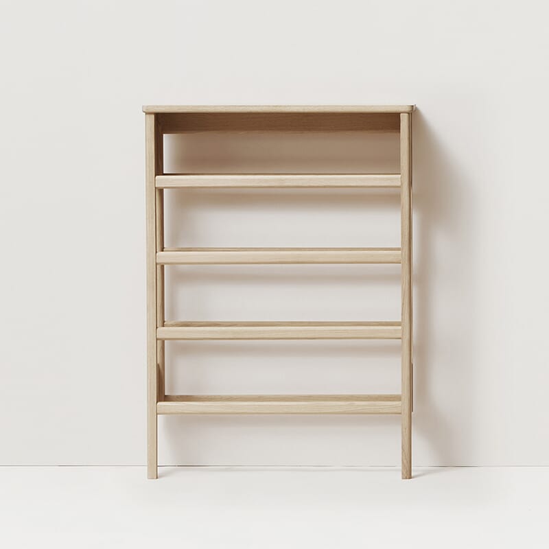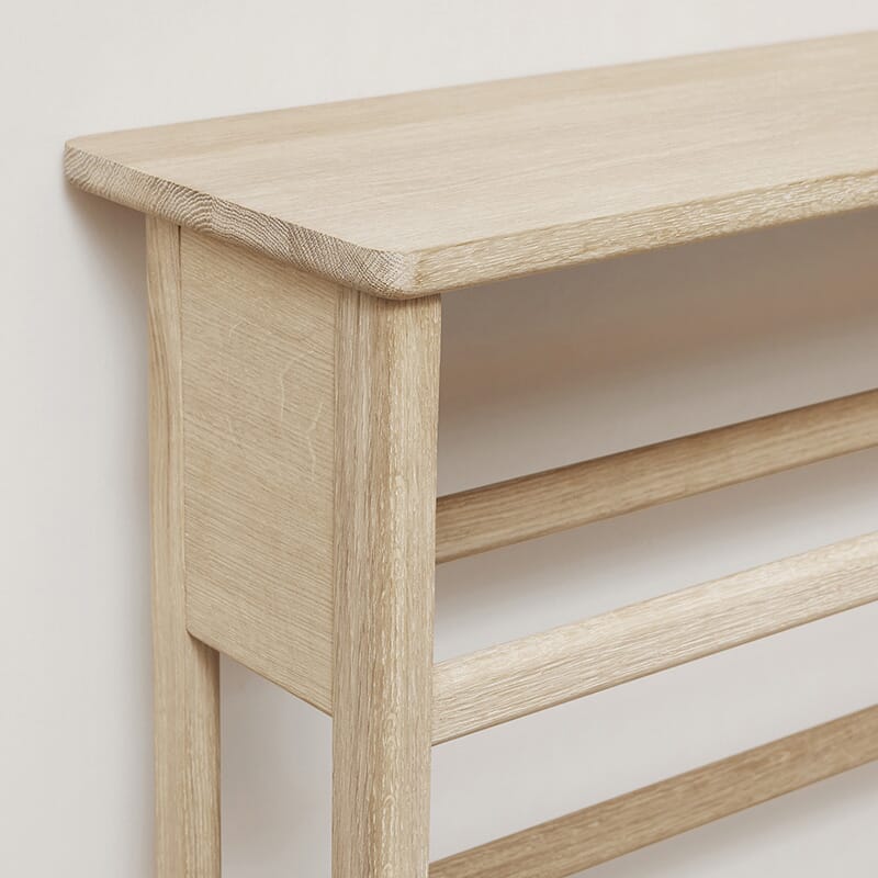 A Line skohyllen er laget for Form & Refine av Herman Studio med målet om å designe en plassbesparende skohylle som også fungerer som konsollbord. Konturene er forsiktig utformet i tråd med klassiske håndverkstradisjoner med respekt for det flotte treverket. Hver hylle har plass til tre par sko, og tolv par totalt. Finnes også i en mindre utgave.