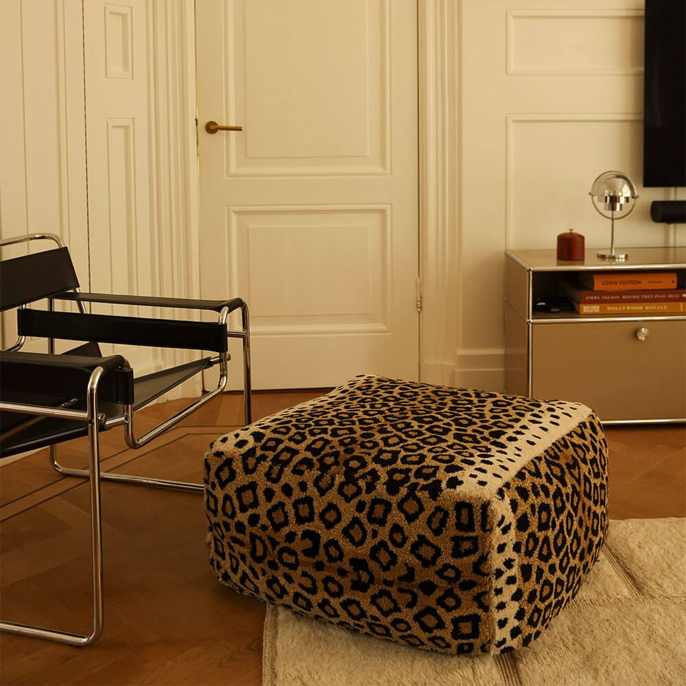 Doing Goods Large Leopard Pouf, en imponerende puff som måler 70 x 70 x 35 cm og er designet for å skape et iøynefallende innslag i ethvert rom. Den har et distinkt leopardmønster som gjør den til et blikkfang, samtidig som den fungerer både som en komfortabel sitteplass og en funksjonell fotskammel. Den tilfører en personlig og unik touch til hjemmet ditt med sitt slående dyremønster.