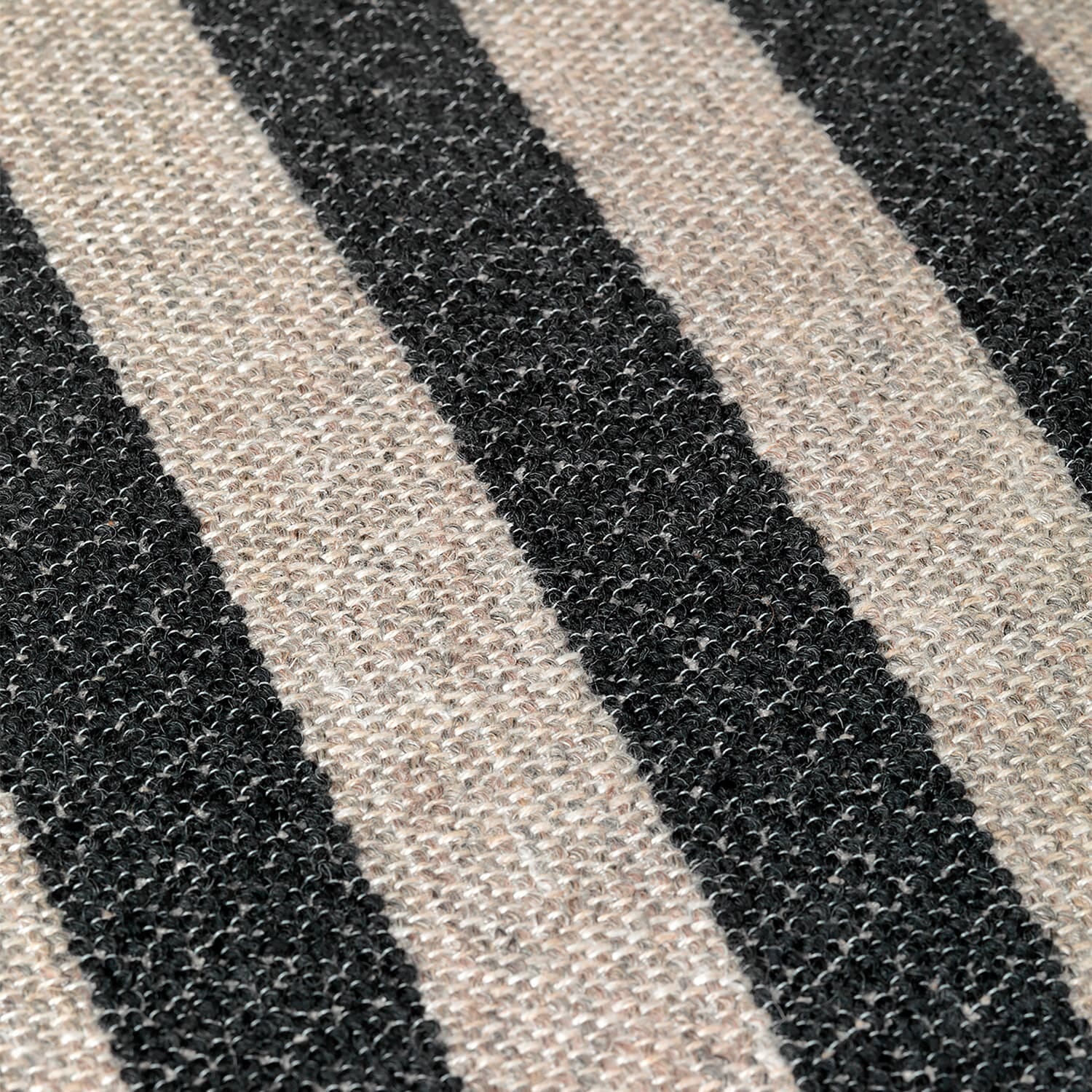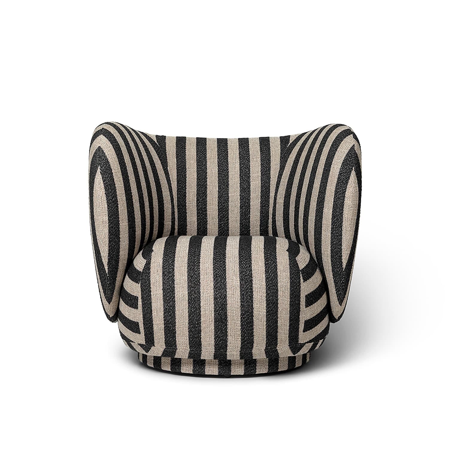 Det klassiske stripemønsteret i sort og sand er inspirert av Louisianas ikoniske arkitektur – de grafiske linjene, de gjennomgående trespilene og de markante vindusrammene. Tekstilet, en strukturert blanding av ull, lin, bomull og viskose, gir en taktil opplevelse som understreker stolens eksklusive uttrykk. Samspillet mellom stoffets stramme geometri og Ricos voluminøse former skaper en vakker balanse mellom streng modernisme og inviterende mykhet.