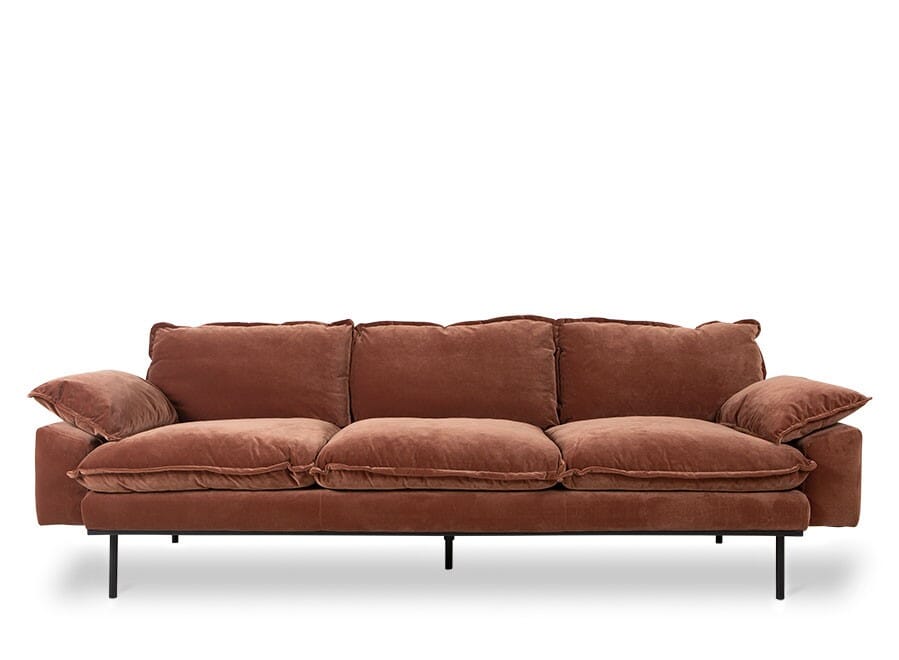 Krydre opp rommet ditt med denne kule 3-seters sofaen fra HK Living. Sofaen er i et mykt stoff i en delikat rød-brun farge. Sofaen har sorte lakkerte metallben og myke puter.