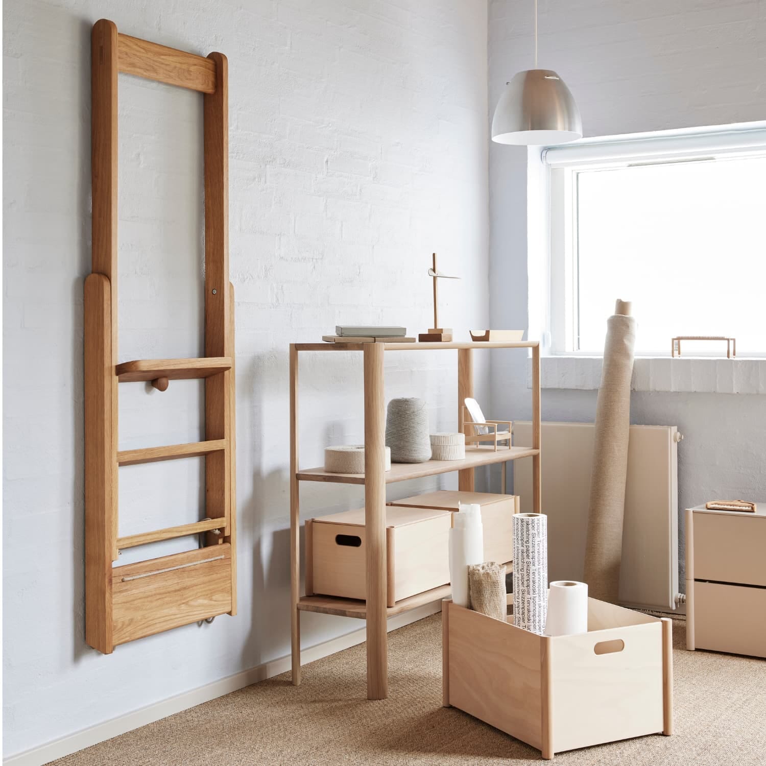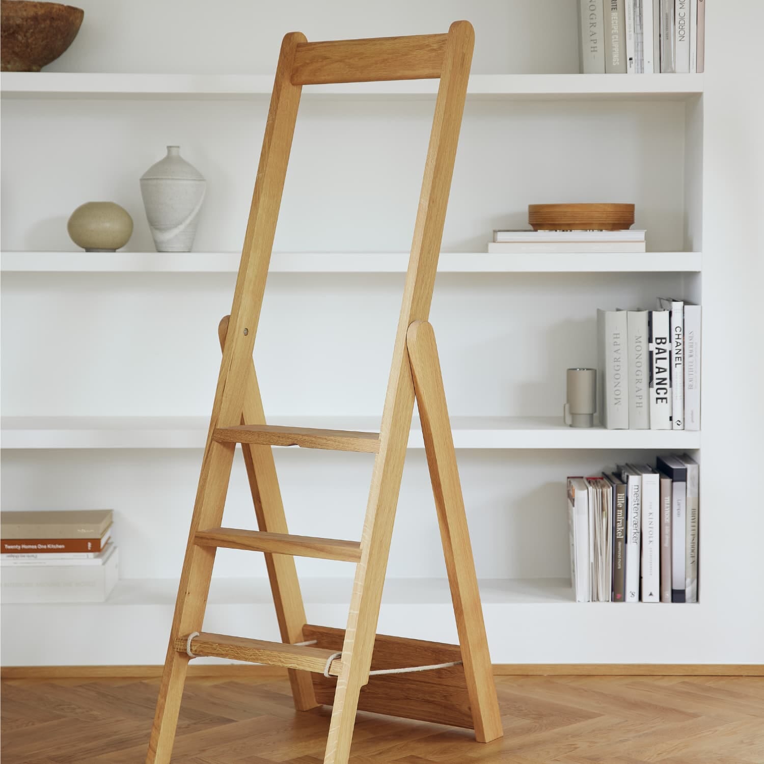 Stigen er nøye utformet med et dypt øverste trinn for ekstra komfort og sikkerhet, samt en solid trestøtte som gir god balanse. En ultrasterk flaggliner sørger for at stigen holdes i riktig vinkel og beskytter veggen når den henger til oppbevaring. Når den ikke er i bruk, kan stigen enkelt foldes sammen og henges opp på den medfølgende trekroken – noe som gjør den til et dekorativt element på veggen.