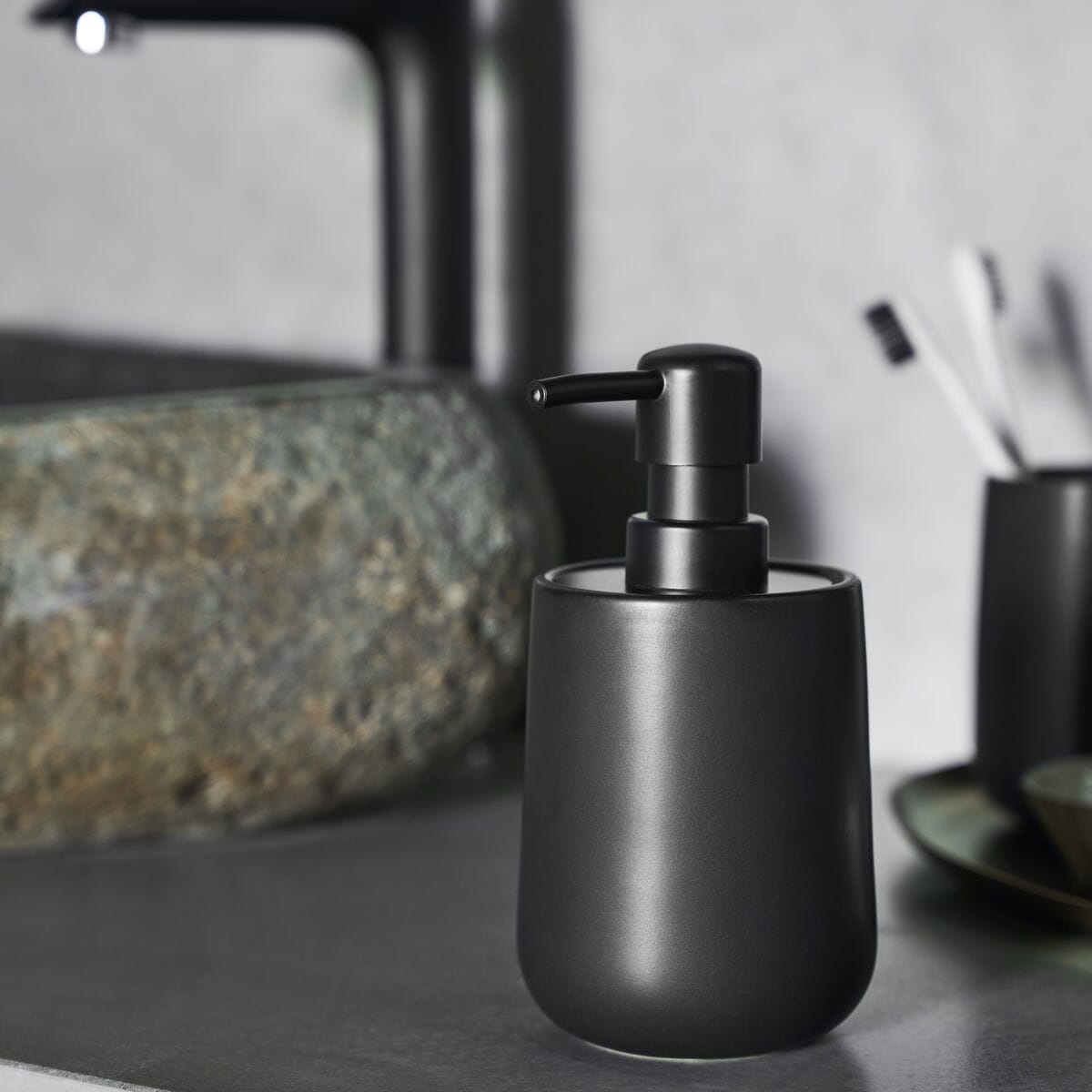 Stilig og tidløs såpedispenser fra House Doctor. Den svarte fargen og det elegante designet gir et tidløst minimalistisk preg på baderommet. Fyll den med din favorittsåpe og trykk ut ønsket mengde. Du kan også velge å ha to dispensere og bruke den andre til håndsprit. Dette er en enkel og effektiv måte å skape en rolig og harmonisk atmosfære på.